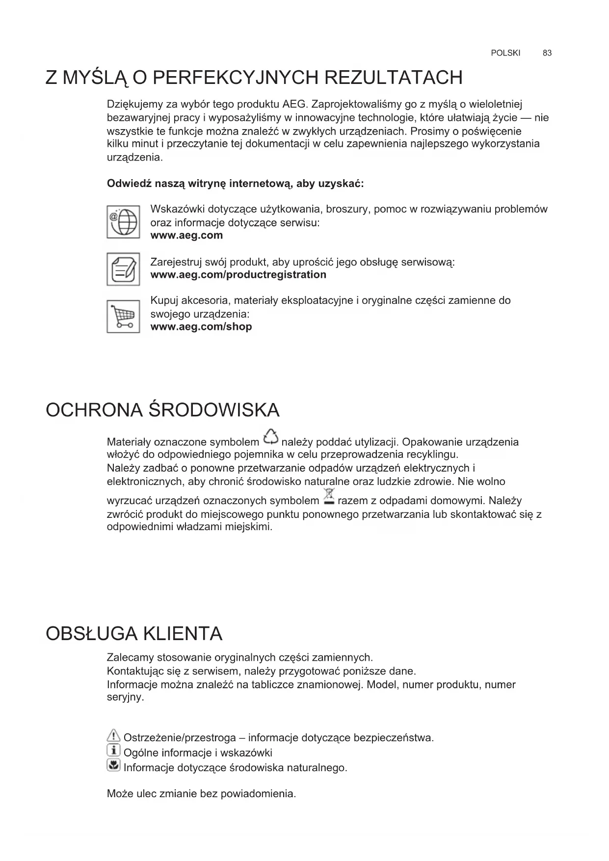 Zalecamy stosowanie oryginalnych czĜİci zamiennych. Kontaktujėc siĜ z serwisem, naleļy przygotowaΕ poniļsze dane. Informacje moļna znaleĺΕ na tabliczce znamionowej. Model, numer produktu, numer seryjny. Ostrzeļenie/przestroga – informacje dotyczėce bezpieczeństwa. Ogólne informacje i wskazówki Informacje dotyczėce İrodowiska naturalnego. Moļe ulec zmianie bez powiadomienia.