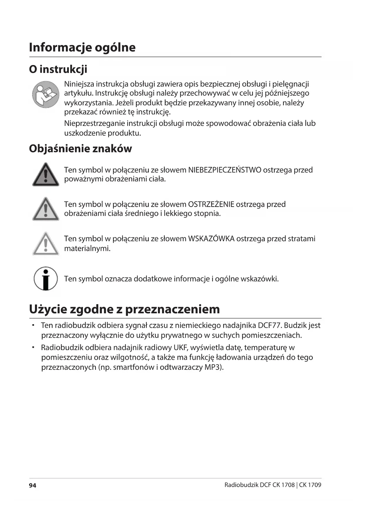 Radiobudzik DCF CK 1708 | CK 1709 Informacje ogólne O instrukcji Niniejsza instrukcja obsługi zawiera opis bezpiecznej obsługi i pielęgnacji artykułu. Instrukcję obsługi należy przechowywać w celu jej późniejszego wykorzystania. Jeżeli produkt będzie przekazywany innej osobie, należy przekazać również tę instrukcję. Nieprzestrzeganie instrukcji obsługi może spowodować obrażenia ciała lub uszkodzenie produktu. Objaśnienie znaków Ten symbol w połączeniu ze słowem NIEBEZPIECZEŃSTWO ostrzega przed poważnymi obrażeniami ciała. Ten symbol w połączeniu ze słowem OSTRZEŻENIE ostrzega przed obrażeniami ciała średniego i lekkiego stopnia. Ten symbol w połączeniu ze słowem WSKAZÓWKA ostrzega przed stratami materialnymi. Ten symbol oznacza dodatkowe informacje i ogólne wskazówki. Użycie zgodne z przeznaczeniem Ten radiobudzik odbiera sygnał czasu z niemieckiego nadajnika DCF77. Budzik jest przeznaczony wyłącznie do użytku prywatnego w suchych pomieszczeniach. Radiobudzik odbiera nadajnik radiowy UKF, wyświetla datę, temperaturę w pomieszczeniu oraz wilgotność, a także ma funkcję ładowania urządzeń do tego przeznaczonych (np. smartfonów i odtwarzaczy MP3). Druckbuch CK 1708_1709.indb 94 24.10.2017 12:56:53Bezpieczeństwo