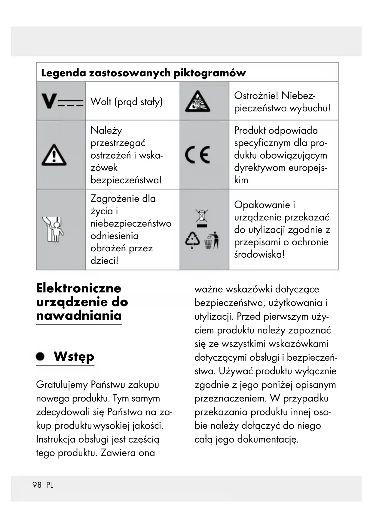 Włączanie / Wyłączanie ekranu ....................................... Strona 113 Wskaźnik stanu baterii ....................................................... Strona 113PL 97 Usuwanie usterek .................................................... Strona 114 Czyszczenie i pielęgnacja .................................. Strona 115 Czyszczenie sita.................................................................. Strona 116 Przechowywanie ..................................................... Strona 116 Utylizacja ........................................................................ Strona 116 Gwarancja ..................................................................... Strona 11798 PL Legenda zastosowanych piktogramów Wolt (prąd stały) Ostrożnie! Niebez- pieczeństwo wybuchu! Należy przestrzegać ostrzeżeń i wska- zówek bezpieczeństwa! Produkt odpowiada specyficznym dla pro- duktu obowiązującym dyrektywom europejs- kim Zagrożenie dla życia i niebezpieczeństwo odniesienia obrażeń przez dzieci!