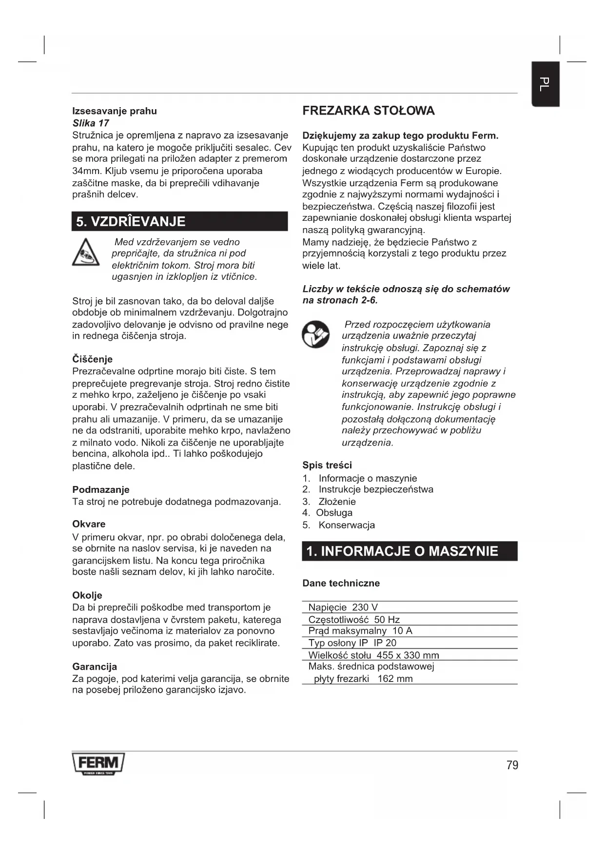 Dziękujemy za zakup tego produktu Ferm. Kupując ten produkt uzyskaliście Państwo doskonałe urządzenie dostarczone przez jednego z wiodących producentów w Europie. Wszystkie urządzenia Ferm są produkowane zgodnie z najwyższymi normami wydajności i bezpieczeństwa. Częścią naszej filozofii jest zapewnianie doskonałej obsługi klienta wspartej naszą polityką gwarancyjną. Mamy nadzieję, że będziecie Państwo z przyjemnością korzystali z tego produktu przez wiele lat. Liczby w tekście odnoszą się do schematów na stronach 2-6. Przedrozpoczęciemużytkowania urządzeniauważnieprzeczytaj instrukcjęobsługi.Zapoznajsięz funkcjamiipodstawamiobsługi urządzenia.Przeprowadzajnaprawyi konserwacjęurządzeniezgodniez instrukcją,abyzapewnićjegopoprawne funkcjonowanie.Instrukcjęobsługii pozostałądołączonądokumentację należyprzechowywaćwpobliżu urządzenia. Spis treści
