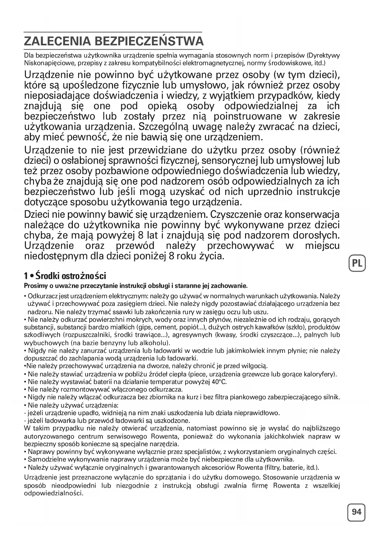- Odkurzacz jest urządzeniem elektrycznym: nale‹y go u‹ywaćw normalnych warunkach u‹ytkowania. Nale‹y u‹ywać i przechowywać poza zasięgiem dzieci. Nie nale‹y nigdy pozostawiać działającego urządzenia bez nadzoru. Nie nale‹y trzymać ssawki lub zakończenia rury w zasięgu oczu lub uszu.