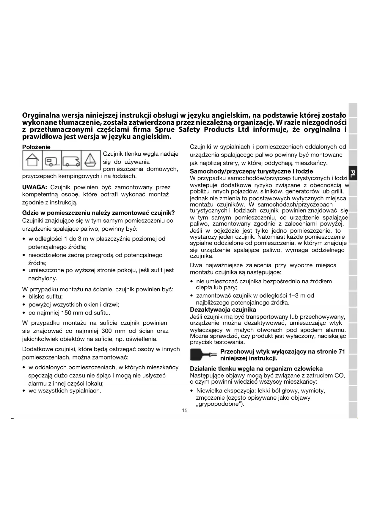 - Niewielka ekspozycja: lekki ból głowy, wymioty, zmęczenie (często opisywane jako objawy „grypopodobne”). Oryginalna wersja niniejszej instrukcji obsługi w języku angielskim, na podstawie której zostało wykonane tłumaczenie, została zatwierdzona przez niezależną organizację. W razie niezgodności z przetłumaczonymi częściami rma Sprue Safety Products Ltd informuje, że oryginalna i prawidłowa jest wersja w języku angielskim.PL