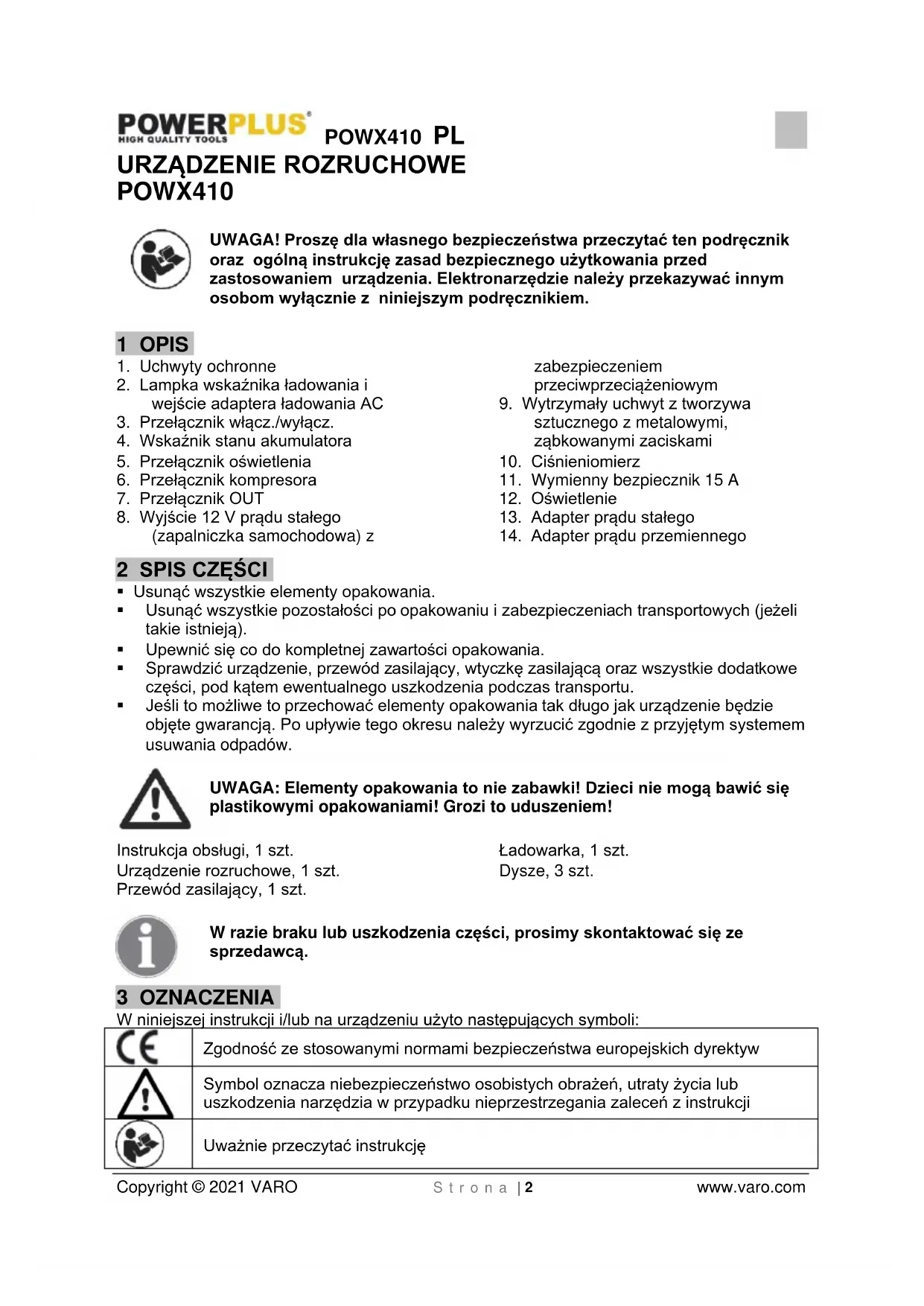- Jeśli to możliwe to przechować elementy opakowania tak długo jak urządzenie będzie objęte gwarancją. Po upływie tego okresu należy wyrzucić zgodnie z przyjętym systemem usuwania odpadów. UWAGA: Elementy opakowania to nie zabawki! Dzieci nie mogą bawić się plastikowymi opakowaniami! Grozi to uduszeniem! Instrukcja obsługi, 1 szt. Urządzenie rozruchowe, 1 szt. Przewód zasilający, 1 szt. Ładowarka, 1 szt. Dysze, 3 szt. W razie braku lub uszkodzenia części, prosimy skontaktować się ze sprzedawcą. 3 OZNACZENIA W niniejszej instrukcji i/lub na urządzeniu użyto następujących symboli: