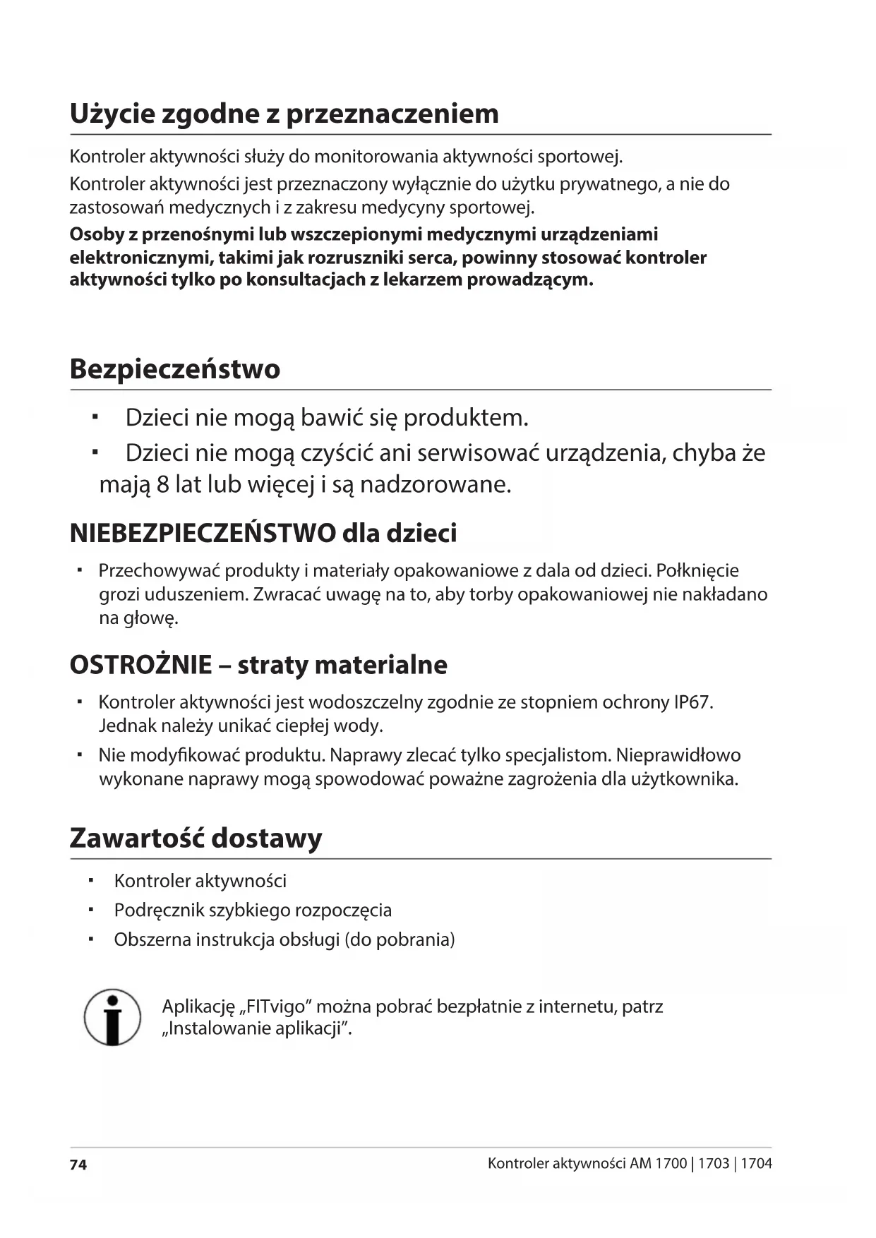 Kontroler aktywności AM 1700 | 1703 | 1704 Użycie zgodne z przeznaczeniem Kontroler aktywności służy do monitorowania aktywności sportowej. Kontroler aktywności jest przeznaczony wyłącznie do użytku prywatnego, a nie do zastosowań medycznych i z zakresu medycyny sportowej. Osoby z przenośnymi lub wszczepionymi medycznymi urządzeniami elektronicznymi, takimi jak rozruszniki serca, powinny stosować kontroler aktywności tylko po konsultacjach z lekarzem prowadzącym. Bezpieczeństwo Dzieci nie mogą bawić się produktem. Dzieci nie mogą czyścić ani serwisować urządzenia, chyba że mają 8 lat lub więcej i są nadzorowane. NIEBEZPIECZEŃSTWO dla dzieci Przechowywać produkty i materiały opakowaniowe z dala od dzieci. Połknięcie grozi uduszeniem. Zwracać uwagę na to, aby torby opakowaniowej nie nakładano na głowę. OSTROŻNIE – straty materialne Kontroler aktywności jest wodoszczelny zgodnie ze stopniem ochrony IP67. Jednak należy unikać ciepłej wody. Nie modykować produktu. Naprawy zlecać tylko specjalistom. Nieprawidłowo wykonane naprawy mogą spowodować poważne zagrożenia dla użytkownika. Zawartość dostawy Kontroler aktywności Podręcznik szybkiego rozpoczęcia Obszerna instrukcja obsługi (do pobrania) Aplikację „FITvigo” można pobrać bezpłatnie z internetu, patrz „Instalowanie aplikacji”. Druckbuch AM 1700.indb 74 24.08.2017 14:08:04W skrócie