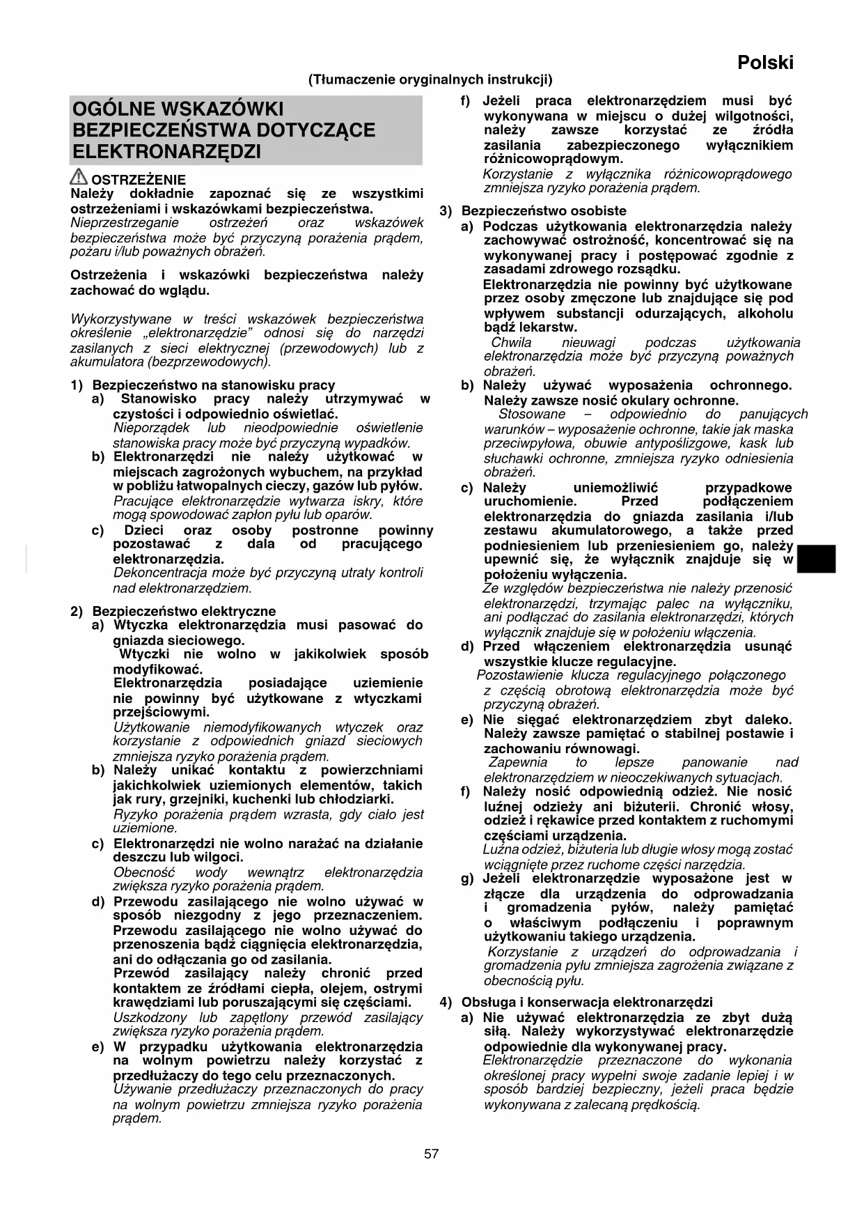 ELEKTRONARZĘDZI OSTRZEŻENIE Należy dokładnie zapoznać się ze wszystkimi ostrzeżeniami i wskazówkami bezpieczeństwa. Nieprzestrzeganie ostrzeżeń oraz wskazówek bezpieczeństwa może być przyczyną porażenia prądem, pożaru i/lub poważnych obrażeń. Ostrzeżenia i wskazówki bezpieczeństwa należy zachować do wglądu. Wykorzystywane w treści wskazówek bezpieczeństwa określenie „elektronarzędzie” odnosi się do narzędzi zasilanych z sieci elektrycznej (przewodowych) lub z akumulatora (bezprzewodowych).