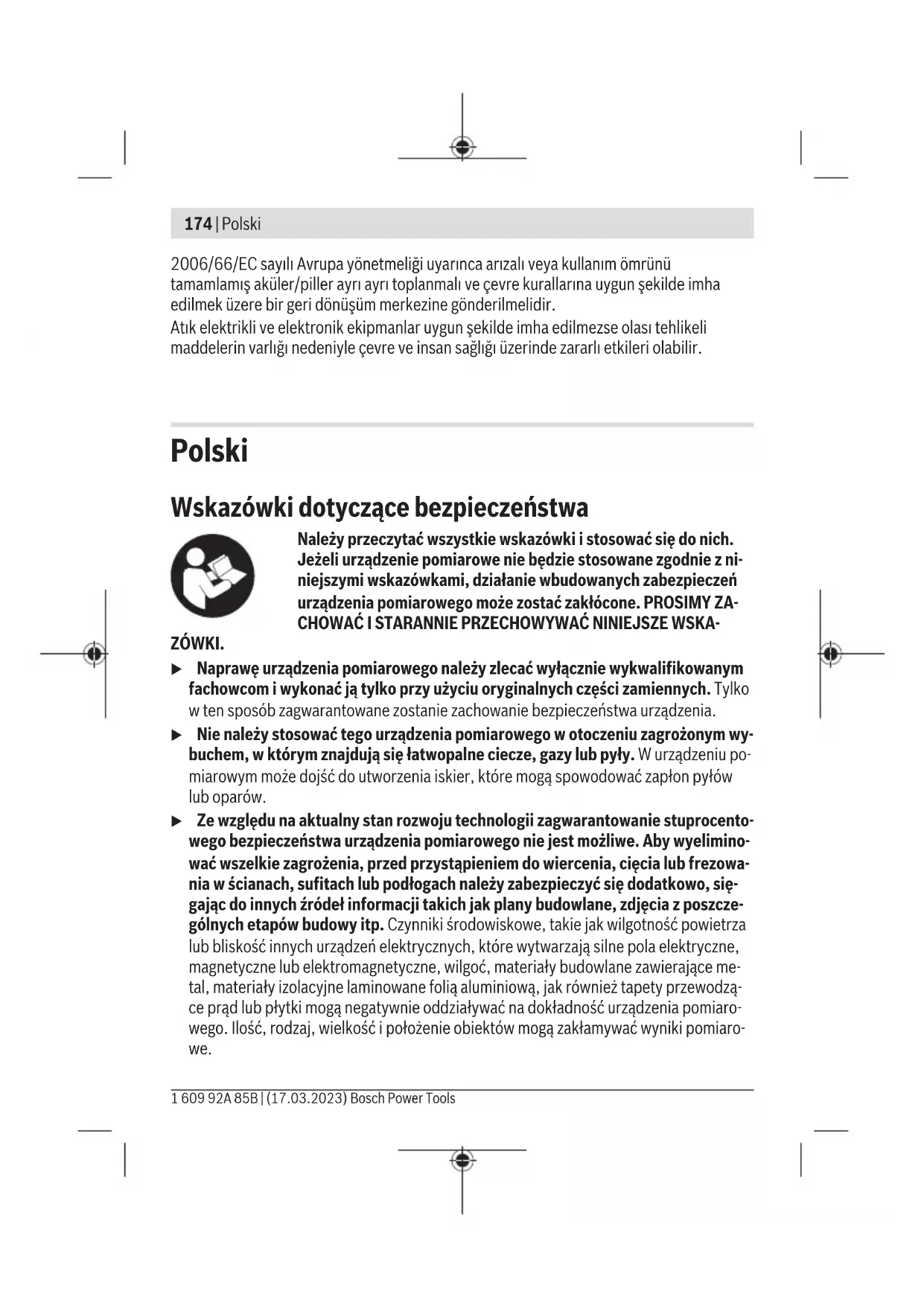 Baterie 4×1,5V LR03(AAA) Czas pracy ok. 4h Waga zgodnie z EPTA-Procedure01:2014 0,34kg Wymiary(długość× szerokość× wysokość) 255× 90× 56mm A) w zależności od trybu pracy, materiału i wielkości obiektów, a także materiału wykonania i stanu podłoża B) Mniejsza głębokość detekcji w przypadku przewodów nieznajdujących się pod napięciem C) odpowiada grubości dwóch płyt gipsowo-kartonowych D) Występuje jedynie zabrudzenie nieprzewodzące, jednak od czasu do czasu okresowo należy spodziewać się zjawiska przewodzenia prądu spowodowanego kondensacją. Do jednoznacznej identyfikacji urządzenia pomiarowego służy numer seryjny (7) podany na tabliczce znamionowej. 1 609 92A 85B | (17.03.2023) Bosch Power ToolsPolski | 177 u W przypadku niekorzystnego składu podłoża wynik pomiaru może okazać się za- niżony w odniesieniu do jego dokładności i głębokości detekcji. Montaż Wkładanie/wymiana baterii Zaleca się eksploatację urządzenia pomiarowego przy użyciu baterii alkaliczno-mangano- wych. Nie należy używać baterii o napięciu nominalnym powyżej 1,5V. Aby otworzyć pokrywkę wnęki na baterie(1) należy zsunąć ją z wnęki w kierunku wska- zanym przez strzałkę. Włożyć baterie. Należy przy tym zwrócić uwagę na zachowanie prawidłowej biegunowości, zgodnej ze schematem umieszczonym wewnątrz wnęki. Wskazanie baterii(f) w pasku stanu na wyświetlaczu pokazuje aktualny stan naładowania baterii. Jeżeli widoczne obok wskazanie pojawi się w pasku stanu na wyświetlaczu, urządzenie pomiarowe może być używane jeszcze przez maks. 15min. Należy wymienić baterie. Baterie należy zawsze wymieniać w komplecie. Należy stosować tylko baterie tego same- go producenta i o jednakowej pojemności. u Jeżeli urządzenie pomiarowe będzie przez dłuższy czas nieużywane, należy wy- jąć z niego baterie. Baterie, które są przez dłuższy czas przechowywane w urządze- niu pomiarowym, mogą ulec korozji i samorozładowaniu. Praca u Urządzenie pomiarowe należy chronić przed wilgocią i bezpośrednim nasłonecz- nieniem. u Urządzenie pomiarowe należy chronić przed ekstremalnie wysokimi lub niskimi temperaturami, a także przed wahaniami temperatury. Wprzypadku, gdy urzą- dzenie pomiarowe poddane było większym wahaniom temperatury, należy przed włączeniem odczekać, aż powróci ono do normalnej temperatury. Ekstremalnie wysokie lub niskie temperatury, a także silne wahania temperatury mogą mieć nega- tywny wpływ na precyzję pomiaru, a także na wskazanie wyświetlane na wyświetla- czu. u Należy unikać silnych uderzeń i nie dopuszczać do upadku urządzenia pomiaro- wego. W przypadku silnego oddziaływania zewnętrznego na urządzenie pomiarowe Bosch Power Tools 1 609 92A 85B | (17.03.2023)178 | Polski oraz w razie stwierdzenia nieprawidłowości podczas pracy urządzenia, należy zlecić przeprowadzenie kontroli urządzenia pomiarowego w autoryzowanym punkcie serwi- sowym firmy Bosch. u Urządzenie pomiarowe należy trzymać wyłącznie za przewidziane do tego celu powierzchnie chwytowe (9), aby nie zakłócać pomiaru. u Nie wolno naklejać żadnych naklejek ani mocować żadnych tabliczek w zakresie działania czujnika(6) na tylnej części urządzenia pomiarowego. W szczególności metalowe tabliczki mają wpływ na wyniki pomiaru. Podczas pomiaru nie należy nosić rękawic, należy także zwrócić uwagę na dostateczne uziemienie. Niedostateczne uziemienie może zakłócać wykrywa- nie przewodów pod napięciem. Podczas pomiaru należy unikać bliskości urządzeń, które wytwarzają silne pola elektryczne, magnetyczne lub elektromagnetyczne, np. telefonów komórkowych, laptopów lub tabletów. W miarę możliwości należy zdezakty- wować we wszystkich urządzeniach funkcje mogące powodować zakłócenia pomiaru lub wyłączyć te urządzenia. Użytkowanie ekranu dotykowego u Nie należy stosować urządzenia pomiarowego, gdy na ekranie dotykowym wi- doczne są uszkodzenia (np. zarysowana powierzchnia itp.). Wyświetlacz jest podzielony na pasek stanu(c) oraz ekran dotykowy z częścią informacyjną(b) oraz częścią nawigacyjną(a). Pasek stanu(c) pokazuje aktualne ustawienie sygnału(e), wskazanie baterii(f) oraz licz- bę stron(d) (w przypadku kilkustronicowego menu). Sterowanie urządzeniem pomiarowym odbywa się za pomocą przycisków na ekranie do- tykowym. u Ekran dotykowy należy obsługiwać wyłącznie palcami. u Ekran dotykowy należy chronić przed kontaktem z wodą i z urządzeniami elektryczny- mi. u Przed przystąpieniem do czyszczenia ekranu dotykowego urządzenie pomiarowe na- leży wyłączyć. Następnie należy wytrzeć zanieczyszczenia np. za pomocą ściereczki z mikrowłókien. Nawigacja w menu Aby móc sterować urządzeniem pomiarowym za pomocą ekranu dotykowego, (oprócz przycisków w danym języku) wyświetlane są także następujące przyciski ogólne: 1 609 92A 85B | (17.03.2023) Bosch Power ToolsPolski | 179 Przycisk Działanie Przejście do poprzedniej strony Przejście do następnej strony Jeden poziom menu niżej/wyżej Pokaż menu<Ustawienia> Pokaż menu<Menu Pomoc> Uruchamianie Włączanie/wyłączanie u Przed włączeniem urządzenia pomiarowego należy upewnić się, czy powierzch- nia zakresu działania czujnika(6) nie uległa zawilgoceniu. Wprzypadku stwier- dzenia wilgoci, urządzenie pomiarowe należy wytrzeć do sucha ściereczką. u Jeżeli urządzenie pomiarowe poddane zostało dużym wahaniom temperatury, należy przed włączeniem pozwolić powrócić mu do normalnej temperatury. Aby włączyć urządzenie pomiarowe, należy nacisnąć włącznik/wyłącznik(2). Należy przestrzegać wskazówek dotyczących eksploatacji urządzenia pomiarowego. Szczegóło- we wskazówki dotyczące poniższych procedur obsługi można wyłączyć w podmenu<Wskazówki>. Aby wyłączyć urządzenie pomiarowe, urządzenie pomiarowe, należy nacisnąć i dłużej przytrzymać wł
