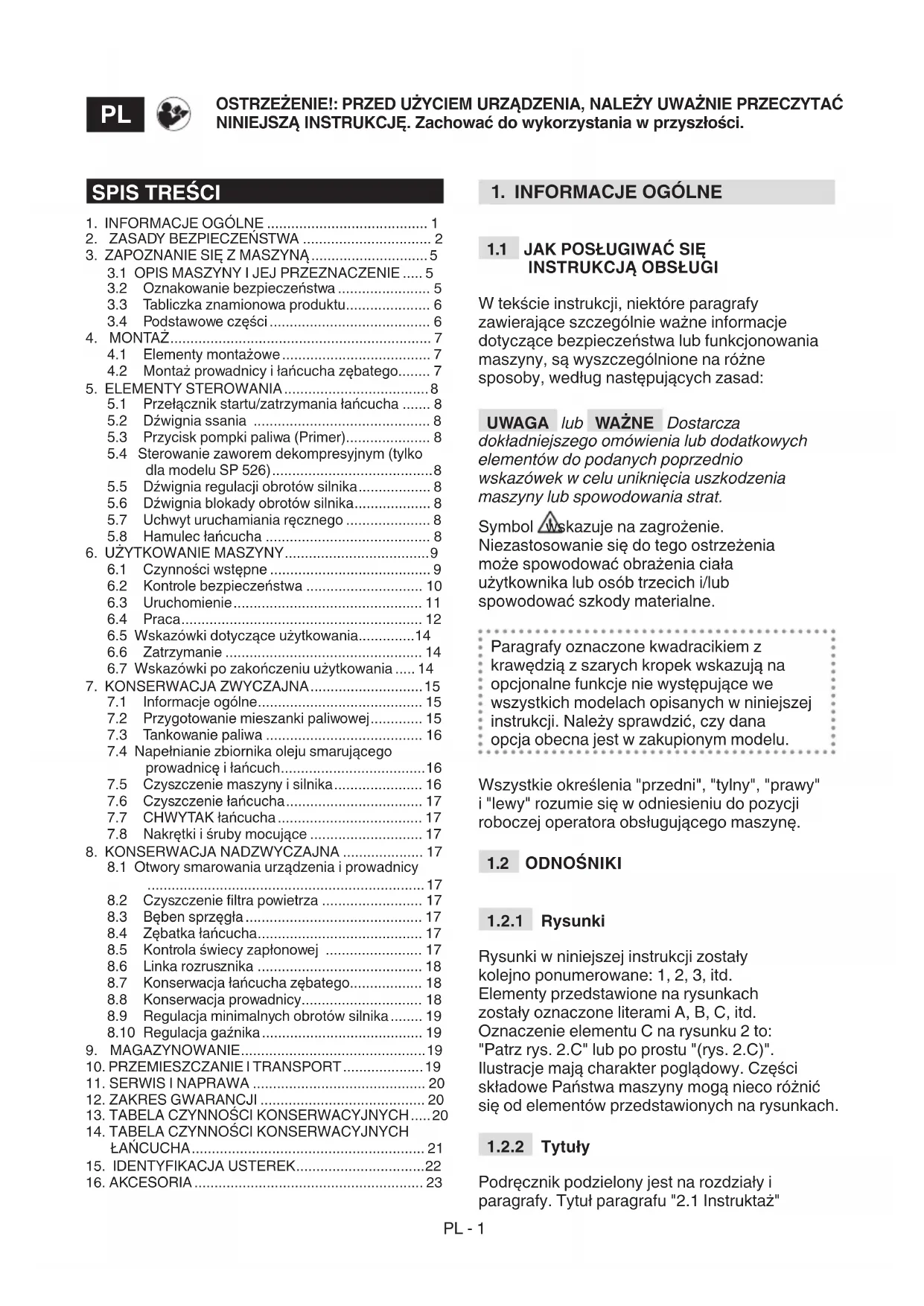 W "Tabeli prawidłowej kombinacji prowadnicy i łańcucha" wymienione są wszystkie kombinacje prowadnicy i łańcucha, możliwe do zastosowania w zależności od typu urządzenia, oznaczone symbolem "". Tabela ta zawiera również dane dystynktywne łańcuchów i prowadnic zatwierdzonych dla każdego typu urządzenia. Podczas korzystania z części zamiennych, należy używać wyłącznie prowadnic i łańcuchów wymienionych w tabeli. Stosowanie kombinacji, które nie zostały zatwierdzone przez producenta może spowodować poważne obrażenia ciała i doprowadzić do uszkodzenia maszyny. Wybór, zastosowanie i wykorzystanie prowadnicy i łańcucha są to czynności wykonywane przez użytkownika przy jego całkowitej niezależności osądu, dlatego też ponosi on odpowiedzialność w przypadku jakichkolwiek szkód powstałych w wyniku jego działań. W przypadku wątpliwości lub braku znajomości specyki konkretnego typu prowadnicy lub łańcucha, należy skontaktować się ze sprzedawcą lub specjalistycznym centrum ogrodniczym.PT - 1