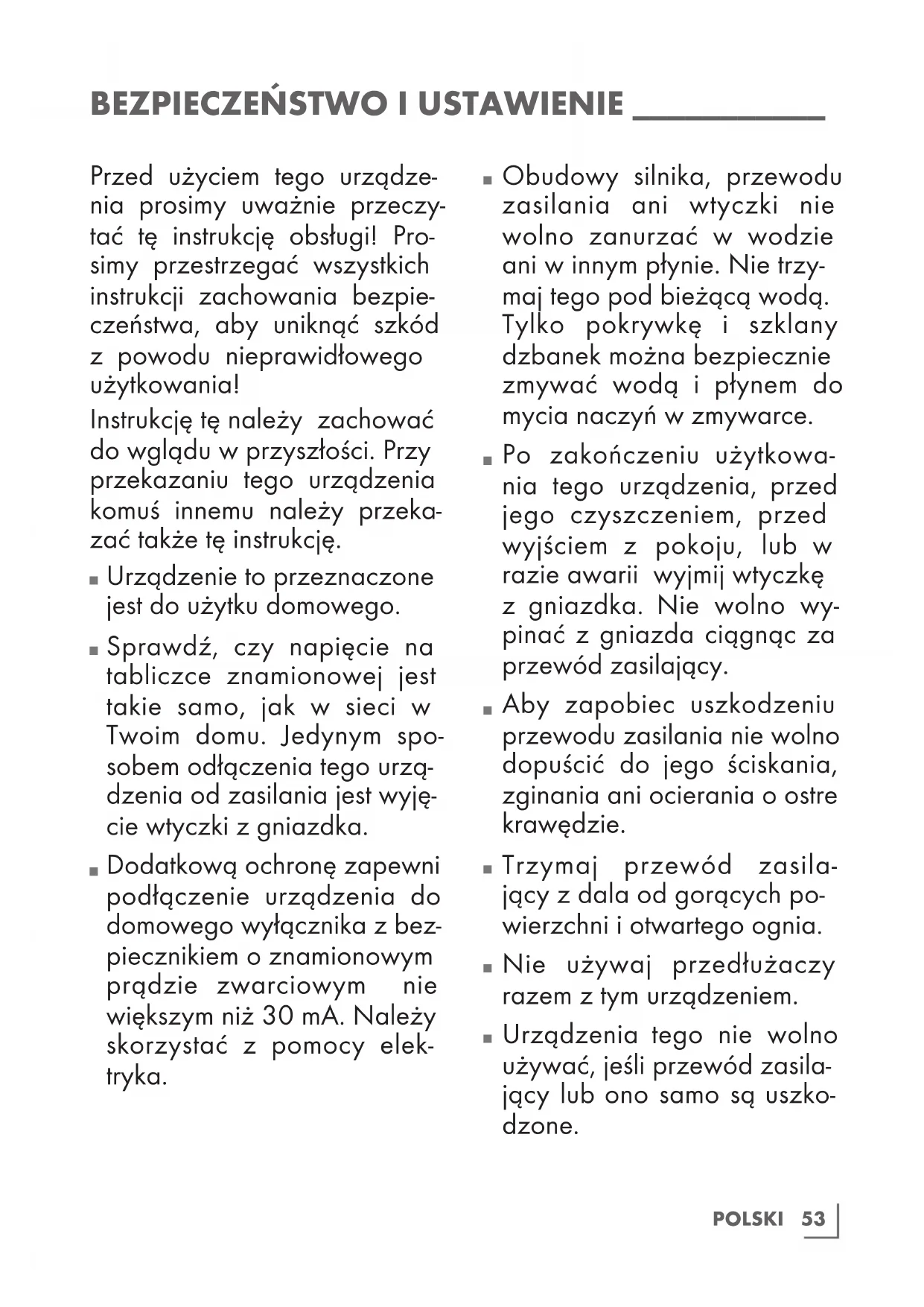 Urządzenia tego nie wolno używać, jeśli przewód zasila- jący lub ono samo są uszko- dzone.54 POLSKI