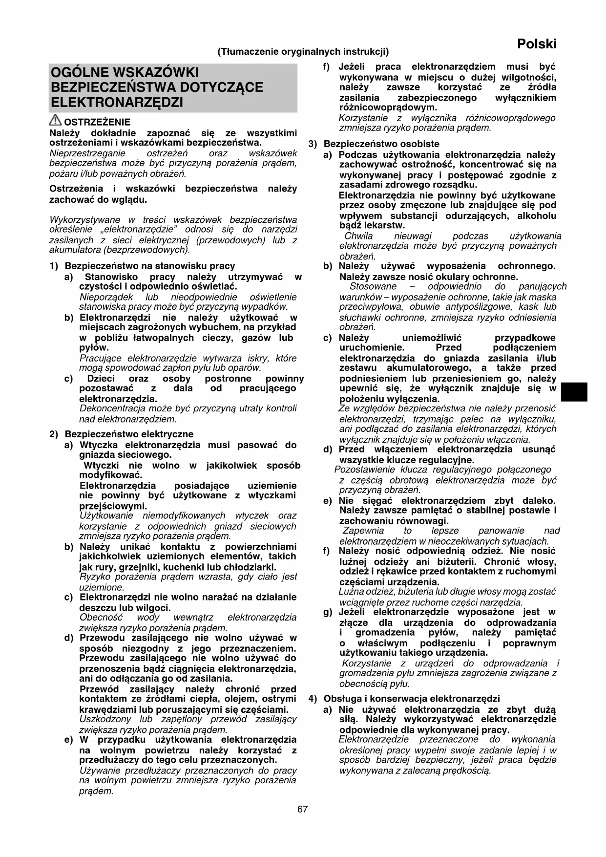 ELEKTRONARZĘDZI OSTRZEŻENIE Należy dokładnie zapoznać się ze wszystkimi ostrzeżeniami i wskazówkami bezpieczeństwa. Nieprzestrzeganie ostrzeżeń oraz wskazówek bezpieczeństwa może być przyczyną porażenia prądem, pożaru i/lub poważnych obrażeń. Ostrzeżenia i wskazówki bezpieczeństwa należy zachować do wglądu. Wykorzystywane w treści wskazówek bezpieczeństwa określenie „elektronarzędzie” odnosi się do narzędzi zasilanych z sieci elektrycznej (przewodowych) lub z akumulatora (bezprzewodowych).