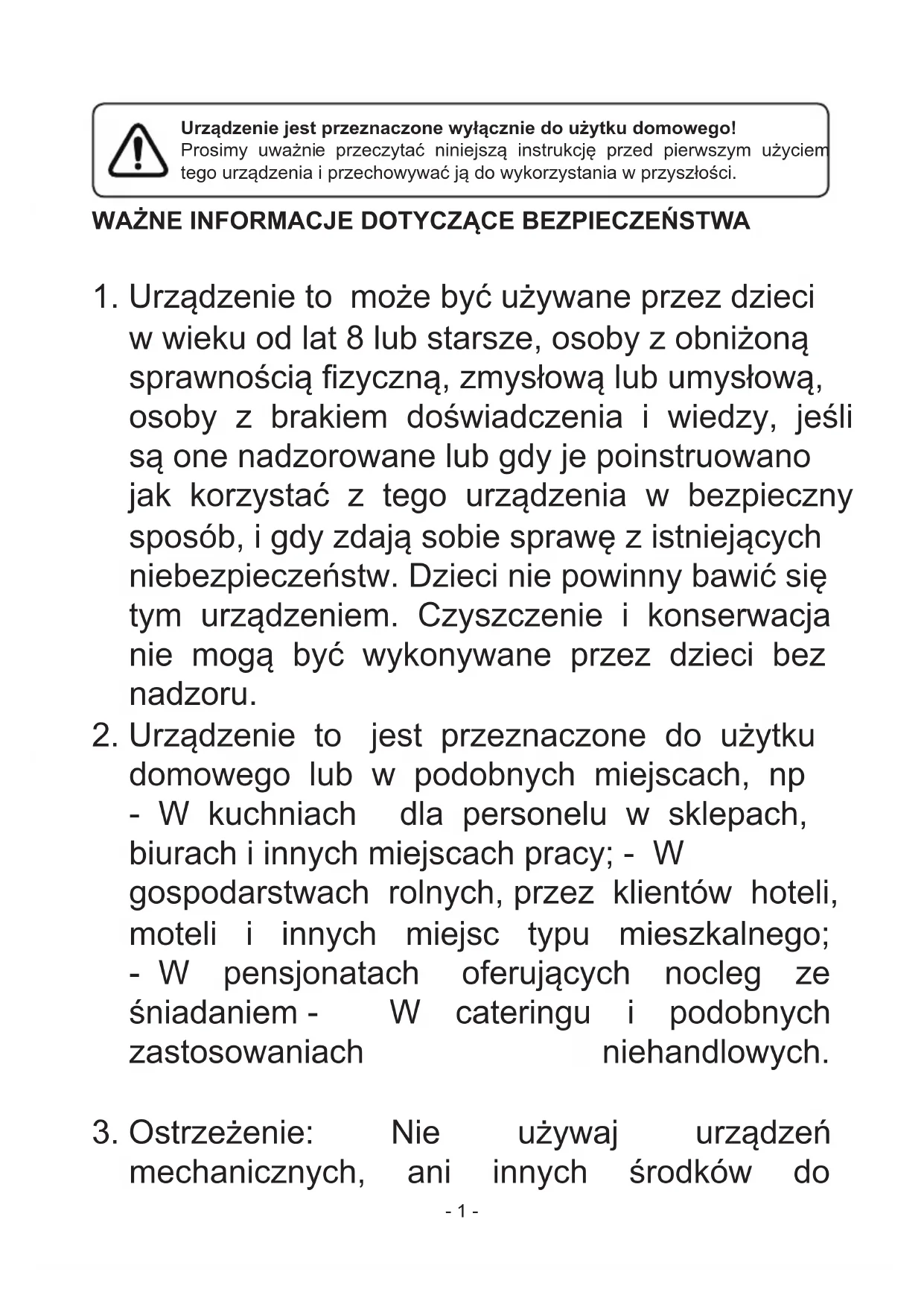 SPECYFIKACJA TECHNICZNA -12-- 1 - Urządzenie jest przeznaczone wyłącznie do użytku domowego! Prosimy uważni e przeczytać niniejszą instrukcję przed pierwszym użyciem tego urządzenia i przechowywać ją do wykorzystania w przyszłości. WAŻNE INFORMACJE DOTYCZĄCE BEZPIECZEŃSTW