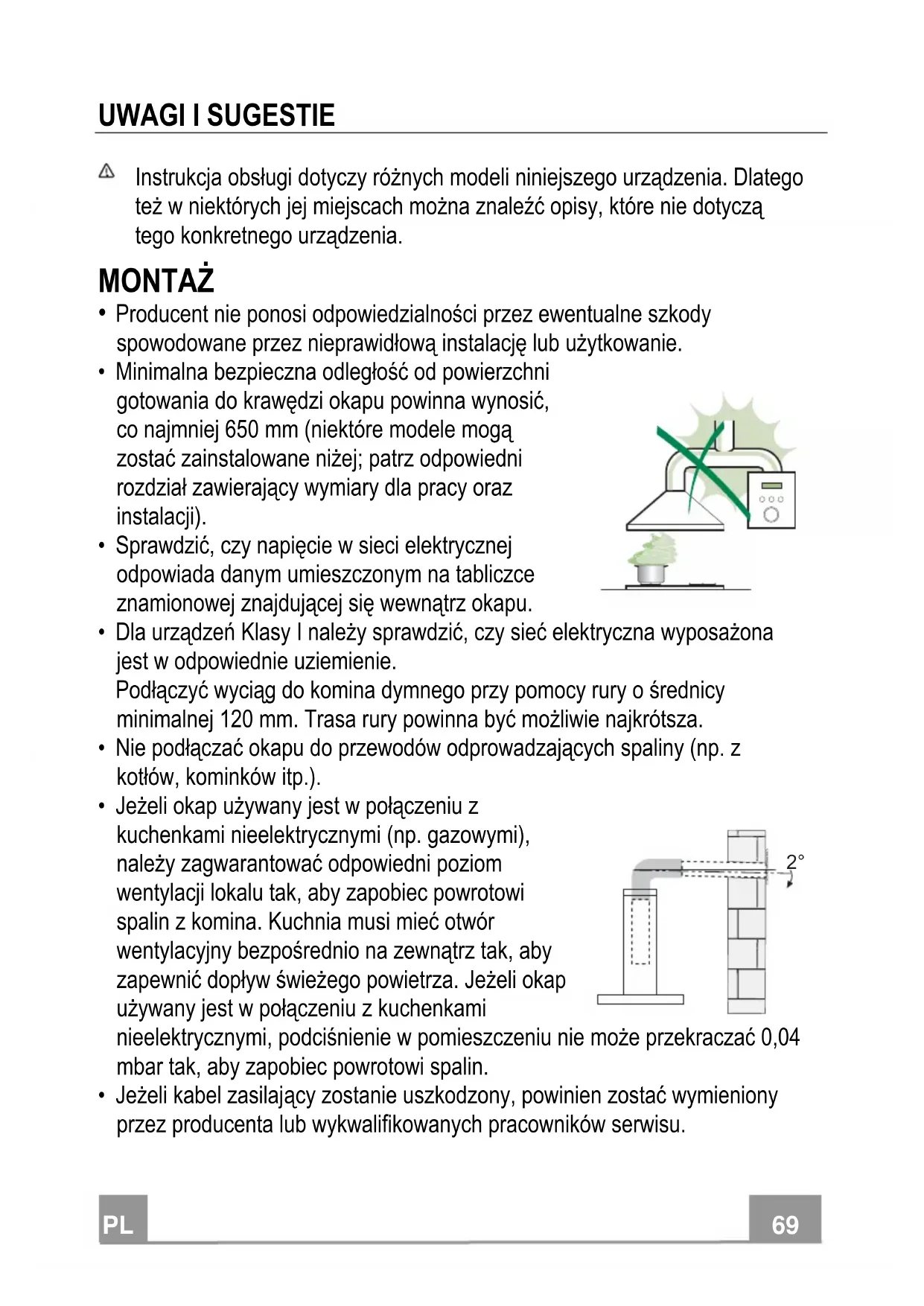 - Nie podłączać okapu do przewodów odprowadzających spaliny (np. z kotłów, kominków itp.).
