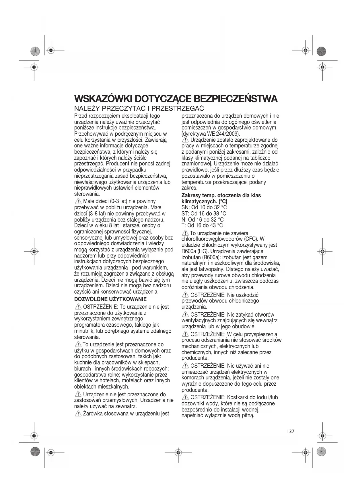 OSTRZEŻENIE: To urządzenie nie jest prze znaczone do użytkowania z wykorzystaniem zewnętrznego programatora czasowego, takiego jak minutnik, lub odrębnego systemu zdalnego sterowania. To urządzenie jest przeznaczone do użytku w gospodarstwach domowych oraz do podobnych zastosowań, takich jak: kuchnie dla pracowników w sklepach, biurach i innych środowiskach roboczych; gospodarstwa rolne; wykorzystanie przez klientów w hotelach, motelach oraz innych obiektach mieszkalnych. Urządzenie nie jest przeznaczone do zastosowań przemysłowych. Urządzenia nie należy używać na zewnątrz. Żarówka stosowana w urządzeniu jest przeznaczona do urządzeń domowych i nie jest odpowiednia do ogólnego oświetlenia pomieszczeń w gospodarstwie domowym (dyrektywa WE 244/2009). Urządzenie zostało zaprojektowane do pracy w miejscach o temperaturze zgodnej z podanymi poniżej zakresami, zależnie od klasy klimatycznej podanej na tabliczce znamionowej. Urządzenie może nie działać prawidłowo, jeśli przez dłuższy czas będzie pozostawało w pomieszczeniu o temperaturze przekraczającej podany zakres. Zakresy temp. otoczenia dla klas klimatycznych. (°C) SN: Od 10 do 32 °C ST: Od 16 do 38 °C N: Od 16 do 32 °C T: Od 16 do 43 °C To urządzenie nie zawiera chlorofluorowęglowodorów (CFC). W układzie chłod niczym wykorzystywany jest R600a (HC). Urządzenia zawierające izobutan (R600a): izobutan jest gazem naturalnym i nieszkodliwym dla środowiska, ale jest łatwopalny. Dlatego należy uważać, aby przewody rurowe obwodu chłodzenia nie uległy uszkodzeniu, zwłaszcza podczas opróżniania obwodu chłodzenia. OSTRZEŻENIE: Nie uszkodzić przewodów obwodu chłodniczego urządzenia. OSTRZEŻENIE: Nie zatykać otworów wentylacyjnych znajdujących się wewnątrz urządzenia lub w jego obudowie. OSTRZEŻENIE: W celu przyspieszenia procesu odszraniania nie stosować środków mechanicznych, elektrycznych lub chemicznych, innych niż zalecane przez producenta. OSTRZEŻENIE: Nie używać ani nie umieszczać urządzeń elektrycznych w komorach urządzenia, jeżeli nie zostały one wyraźnie dopuszczone do tego celu przez producenta. OSTRZEŻENIE: Kostkarki do lodu i/lub dozowniki wody, które nie są podłączone bezpośrednio do instalacji wodnej, napełniać wyłącznie wodą pitną.