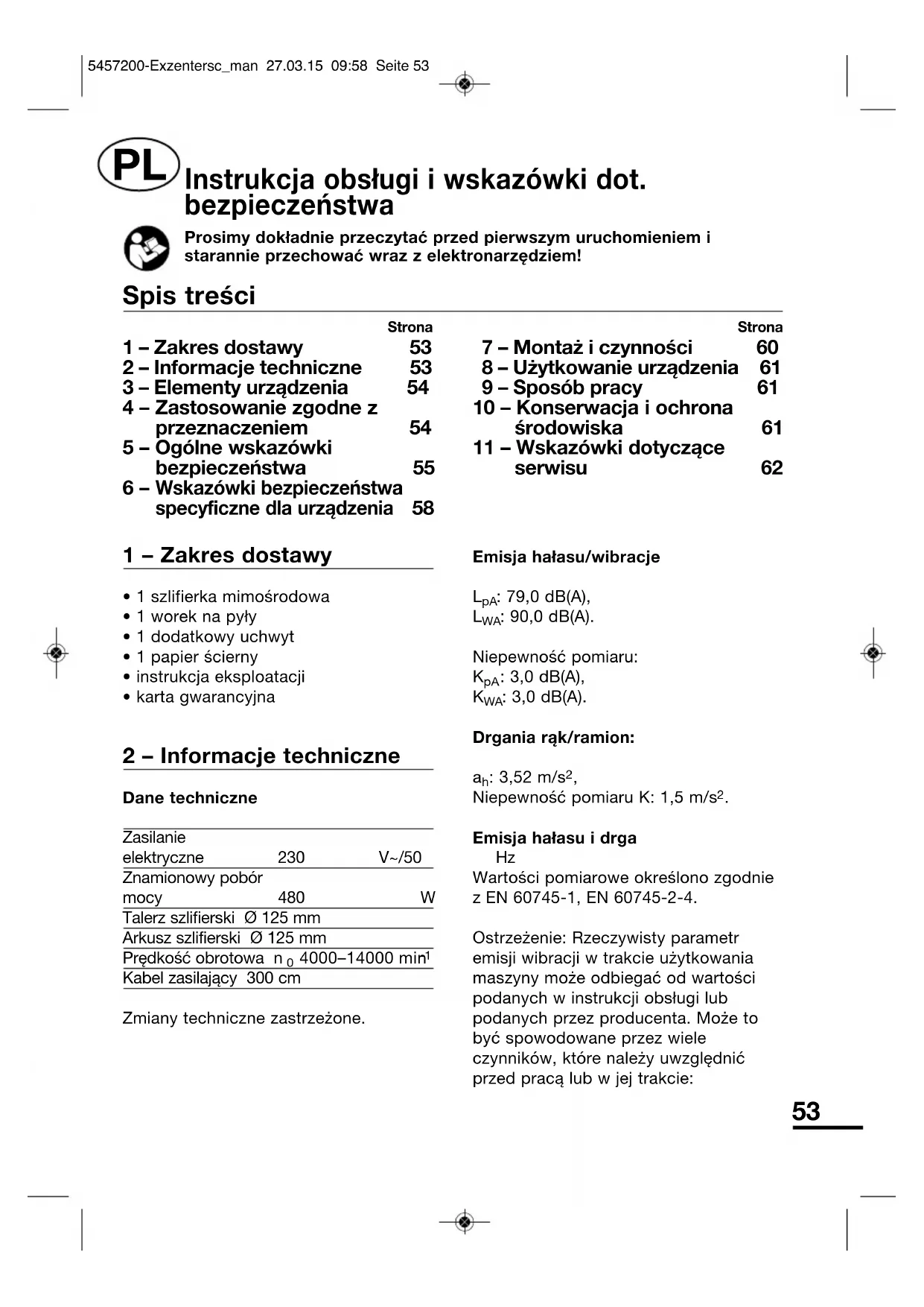 Strona 7 – Montaż i czynności 60 8 – Użytkowanie urządzenia 61 9 – Sposób pracy 61 10 – Konserwacja i ochrona środowiska 61 11 – Wskazówki dotyczące serwisu 62 Spis treści 5457200-Exzentersc_man 27.03.15 09:58 Seite 5354