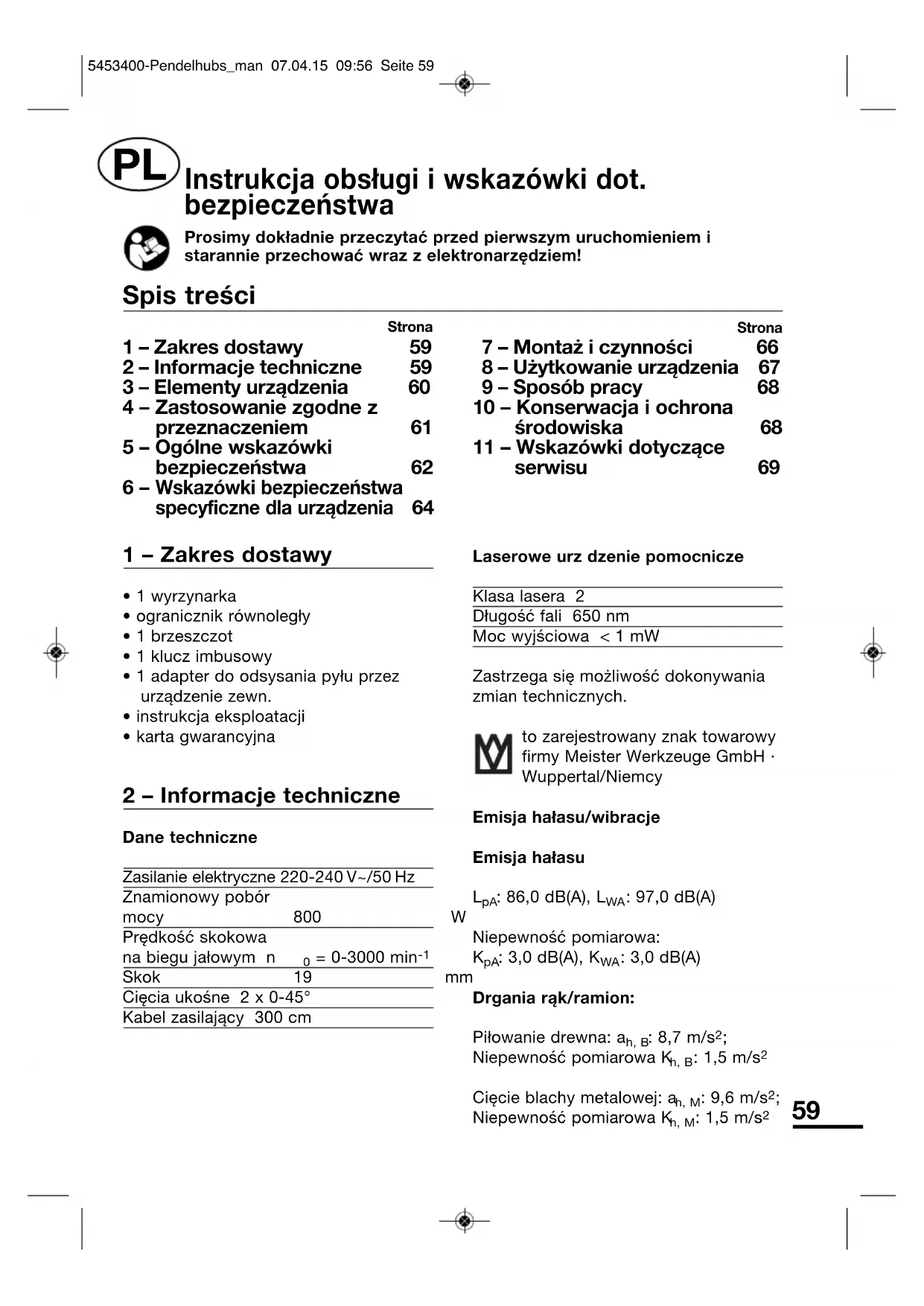 - 1 wyrzynarka• ogranicznik równoległy• 1 brzeszczot• 1 klucz imbusowy• 1 adapter do odsysania pyłu przezurządzenie zewn.• instrukcja eksploatacji• karta gwarancyjna 2 – Informacje techniczne Dane techniczneZasilanie elektryczne 220-240 V~/50 HzZnamionowy pobórmocy 800 WPrędkość skokowana biegu jałowym n = 0-3000 min Skok 19 mmCięcia ukośne 2 x 0-45°Kabel zasilający 300 cmLaserowe urz dzenie pomocniczeKlasa lasera 2Długość fali 650 nmMoc wyjściowa < 1 mWZastrzega się możliwość dokonywaniazmian technicznych.to zarejestrowany znak towarowyfirmy Meister Werkzeuge GmbH ·Wuppertal/NiemcyEmisja hałasu/wibracje Emisja hałasu