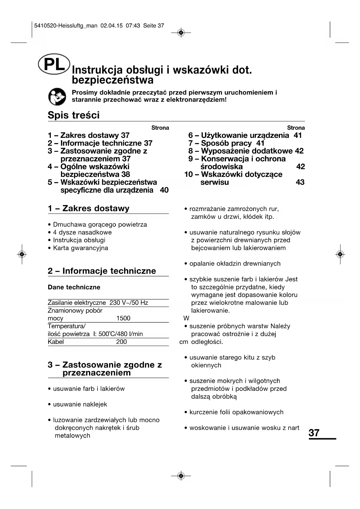 Strona 6 – Użytkowanie urządzenia 41 7 – Sposób pracy 41 8 – Wyposażenie dodatkowe 42 9 – Konserwacja i ochrona środowiska 42 10 – Wskazówki dotyczące serwisu 43 Spis treści 5410520-Heissluftg_man 02.04.15 07:43 Seite 37• kurczenie połączeń poliwinylowych