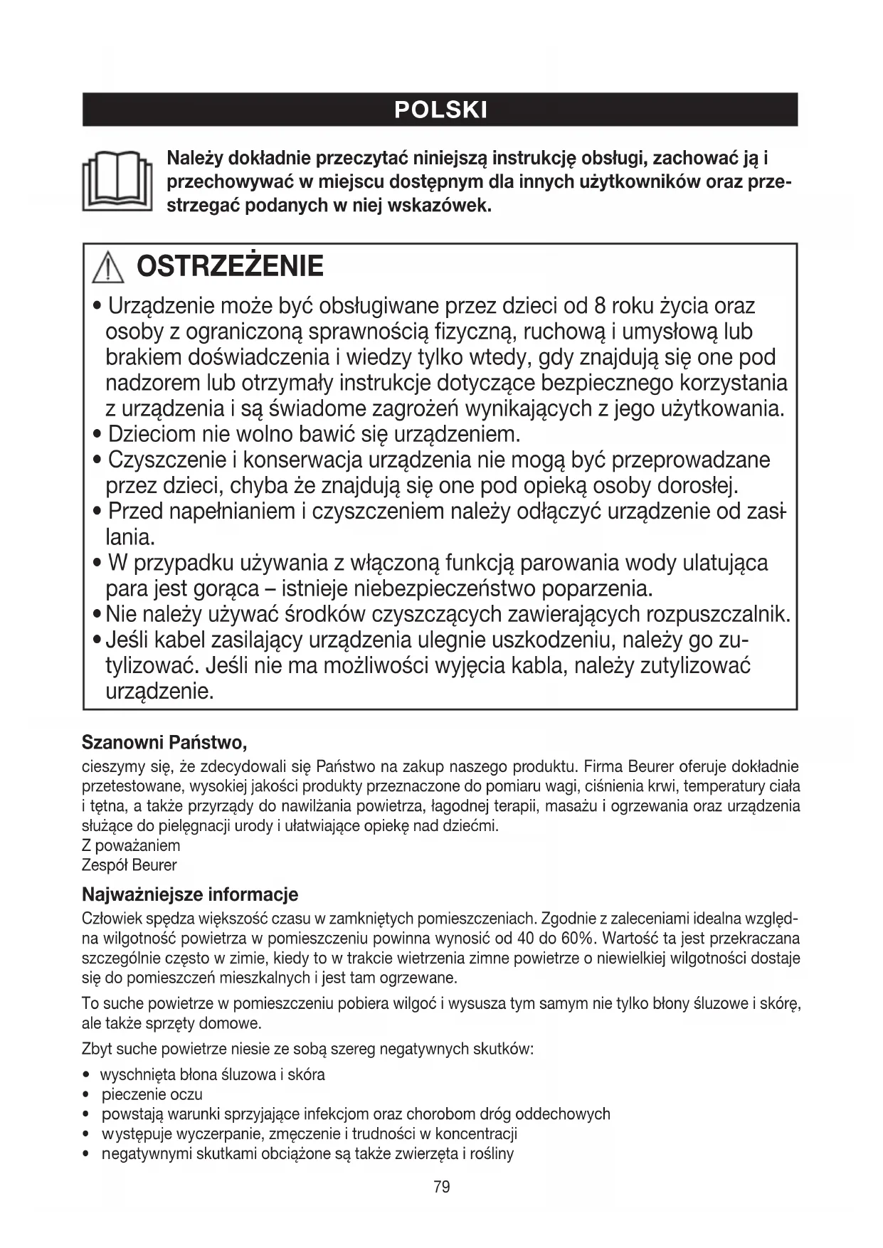 - Jeśli kabel zasilający urządzenia ulegnie uszkodzeniu, należy go zu- tylizować. Jeśli nie ma możliwości wyjęcia kabla, należy zutylizować urządzenie. Szanowni Państwo, cieszymy się, że zdecydowali się Państwo na zakup naszego produktu. Firma Beurer oferuje dokładnie przetestowane, wysokiej jakości produkty przeznaczone do pomiaru wagi, ciśnienia krwi, temperatury ciała i tętna, a także przyrządy do nawilżania powietrza, łagodnej terapii, masażu i ogrzewania oraz urządzenia służące do pielęgnacji urody i ułatwiające opiekę nad dziećmi. Z poważaniem Zespół Beurer Najważniejsze informacje Człowiek spędza większość czasu w zamkniętych pomieszczeniach. Zgodnie z zaleceniami idealna względ- na wilgotność powietrza w pomieszczeniu powinna wynosić od 40 do 60%. Wartość ta jest przekraczana szczególnie często w zimie, kiedy to w trakcie wietrzenia zimne powietrze o niewielkiej wilgotności dostaje się do pomieszczeń mieszkalnych i jest tam ogrzewane. To suche powietrze w pomieszczeniu pobiera wilgoć i wysusza tym samym nie tylko błony śluzowe i skórę, ale także sprzęty domowe. Zbyt suche powietrze niesie ze sobą szereg negatywnych skutków: