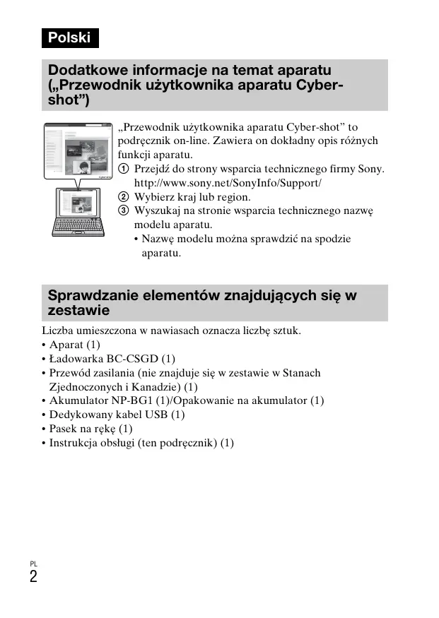 Polski Dodatkowe informacje na temat aparatu („Przewodnik użytkownika aparatu Cybershot”) „Przewodnik użytkownika aparatu Cyber-shot” to podręcznik on-line. Zawiera on dokładny opis różnych funkcji aparatu. 1 Przejdź do strony wsparcia technicznego firmy Sony. http://www.sony.net/SonyInfo/Support/ 2 Wybierz kraj lub region. 3 Wyszukaj na stronie wsparcia technicznego nazwę modelu aparatu.