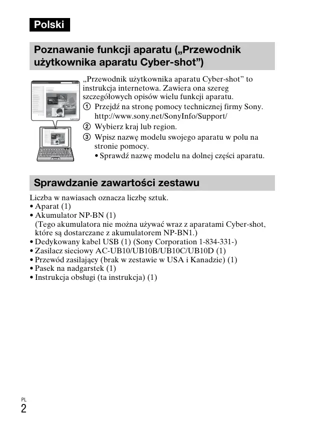 Polski Poznawanie funkcji aparatu („Przewodnik użytkownika aparatu Cyber-shot”) „Przewodnik użytkownika aparatu Cyber-shot” to instrukcja internetowa. Zawiera ona szereg szczegółowych opisów wielu funkcji aparatu. 1 Przejdź na stronę pomocy technicznej firmy Sony. http://www.sony.net/SonyInfo/Support/ 2 Wybierz kraj lub region. 3 Wpisz nazwę modelu swojego aparatu w polu na stronie pomocy.