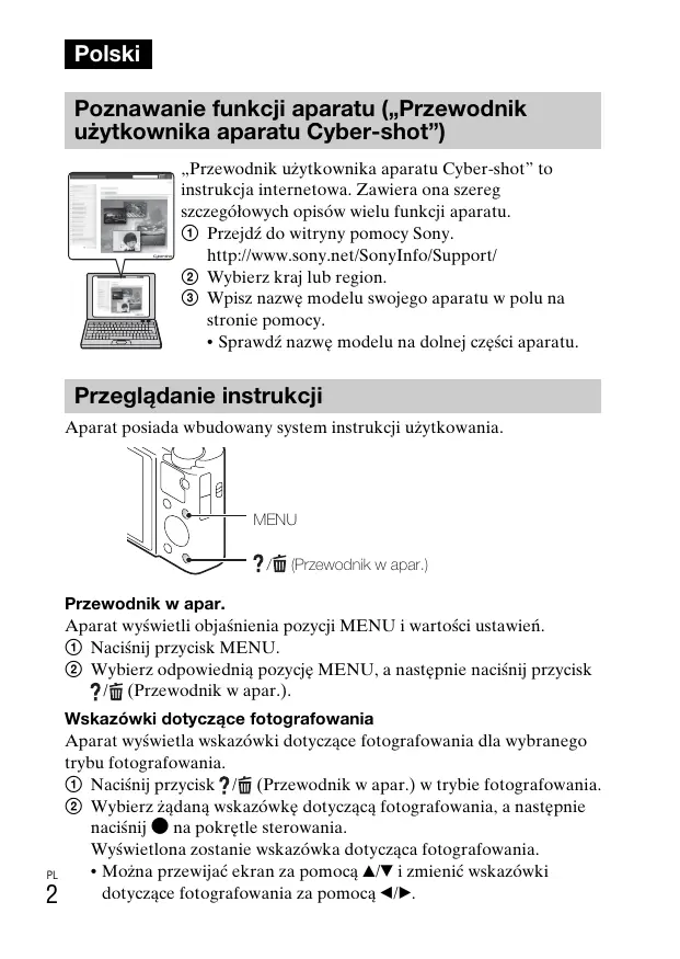 Polski Poznawanie funkcji aparatu („Przewodnik użytkownika aparatu Cyber-shot”) „Przewodnik użytkownika aparatu Cyber-shot” to instrukcja internetowa. Zawiera ona szereg szczegółowych opisów wielu funkcji aparatu. 1 Przejdź do witryny pomocy Sony. http://www.sony.net/SonyInfo/Support/ 2 Wybierz kraj lub region. 3 Wpisz nazwę modelu swojego aparatu w polu na stronie pomocy.