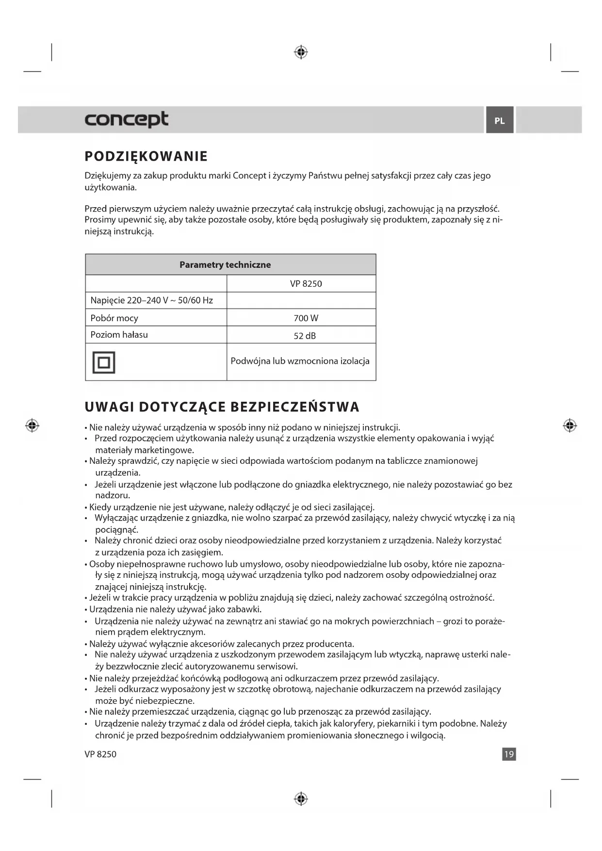 VP8250 - Odkurzacz Concept - Bezpłatna instrukcja obsługi
