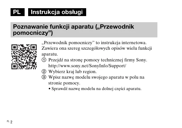 Instrukcja obsługi Poznawanie funkcji aparatu („Przewodnik pomocniczy”) „Przewodnik pomocniczy” to instrukcja internetowa. Zawiera ona szereg szczegółowych opisów wielu funkcji aparatu. 1 Przejdź na stronę pomocy technicznej firmy Sony. http://www.sony.net/SonyInfo/Support/ 2 Wybierz kraj lub region. 3 Wpisz nazwę modelu swojego aparatu w polu na stronie pomocy.