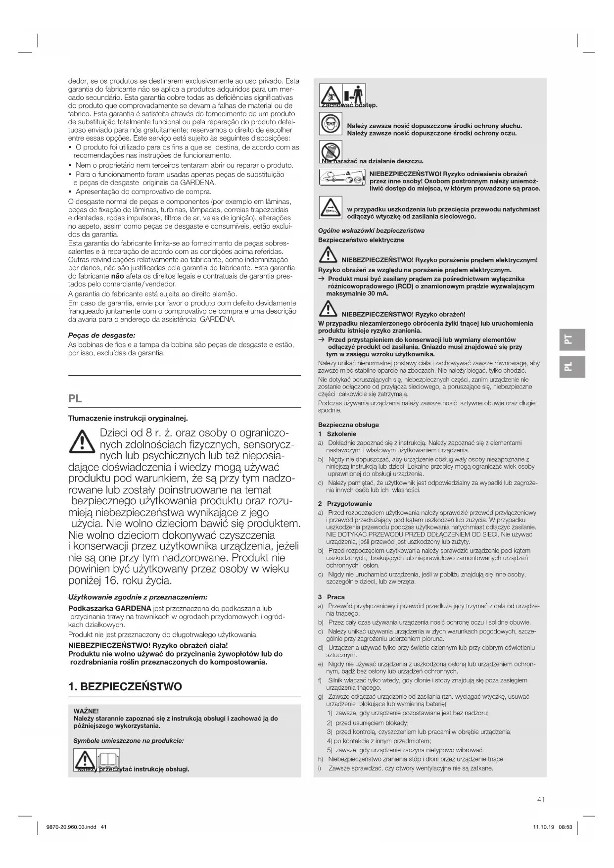 Tłumaczenie instrukcji oryginalnej. Dzieci od 8 r. ż. oraz osoby o ograniczo- nych zdolnościach fizycznych, sensorycz- nych lub psychicznych lub też nieposia- dające doświadczenia i wiedzy mogą używać produktu pod warunkiem, że są przy tym nadzo- rowane lub zostały poinstruowane na temat bezpiecznego użytkowania produktu oraz rozu- mieją niebezpieczeństwa wynikające z jego użycia. Nie wolno dzieciom bawić się produktem. Nie wolno dzieciom dokonywać czyszczenia i konserwacji przez użytkownika urządzenia, jeżeli nie są one przy tym nadzorowane. Produkt nie powinien być użytkowany przez osoby wwieku poniżej 16. roku życia. Użytkowanie zgodnie zprzeznaczeniem: Podkaszarka GARDENA jest przeznaczona do podkaszania lub przycinania trawy na trawnikach w ogrodach przydomowych i ogród- kachdziałkowych. Produkt nie jest przeznaczony do długotrwałego użytkowania. NIEBEZPIECZEŃSTWO! Ryzyko obrażeń ciała! Produktu nie wolno używać do przycinania żywopłotów lub do rozdrabniania roślin przeznaczonych do kompostowania. Zachować odstęp. Należy zawsze nosić dopuszczone środki ochrony słuchu. Należy zawsze nosić dopuszczone środki ochrony oczu. Nie narażać na działanie deszczu. NIEBEZPIECZEŃSTWO! Ryzyko odniesienia obrażeń przez inne osoby! Osobom postronnym należy uniemoż- liwić dostęp do miejsca, w którym prowadzone są prace. wprzypadku uszkodzenia lub przecięcia przewodu natychmiast odłączyć wtyczkę od zasilania sieciowego. Ogólne wskazówki bezpieczeństwa Bezpieczeństwo elektryczne NIEBEZPIECZEŃSTWO! Ryzyko porażenia prądem elektrycznym! Ryzyko obrażeń ze względu na porażenie prądem elektrycznym. v Produkt musi być zasilany prądem za pośrednictwem wyłącznika różnicowoprądowego (RCD) o znamionowym prądzie wyzwalającym maksymalnie 30 mA. NIEBEZPIECZEŃSTWO! Ryzyko obrażeń! W przypadku niezamierzonego obrócenia żyłki tnącej lub uruchomienia produktu istnieje ryzyko zranienia. v Przed przystąpieniem do konserwacji lub wymiany elementów odłączyć produkt od zasilania. Gniazdo musi znajdować się przy tym w zasięgu wzroku użytkownika. Należy unikać nienormalnej postawy ciała i zachowywać zawsze równowagę, aby zawsze mieć stabilne oparcie na zboczach. Nie należy biegać, tylko chodzić. Nie dotykać poruszających się, niebezpiecznych części, zanim urządzenie nie zostanie odłączone od przyłącza sieciowego, a poruszające się, niebezpieczne części całkowicie się zatrzymają. Podczas używania urządzenia należy zawsze nosić sztywne obuwie oraz długie spodnie. Bezpieczna obsługa 1 Szkolenie a) Dokładnie zapoznać się z instrukcją. Należy zapoznać się z elementami nastawczymi i właściwym użytkowaniem urządzenia. b) Nigdy nie dopuszczać, aby urządzenie obsługiwały osoby niezapoznane z niniejszą instrukcją lub dzieci. Lokalne przepisy mogą ograniczać wiek osoby uprawnionej do obsługi urządzenia. c) Należy pamiętać, że użytkownik jest odpowiedzialny za wypadki lub zagroże- nia innych osób lub ich własności. 2 Przygotowanie a) Przed rozpoczęciem użytkowania należy sprawdzić przewód przyłączeniowy i przewód przedłużający pod kątem uszkodzeń lub zużycia. W przypadku uszkodzenia przewodu podczas użytkowania natychmiast odłączyć zasilanie. NIE DOTYKAĆ PRZEWODU PRZED ODŁĄCZENIEM OD SIECI. Nie używać urządzenia, jeśli przewód jest uszkodzony lub zużyty. b) Przed rozpoczęciem użytkowania należy sprawdzić urządzenie pod kątem uszkodzonych, brakujących lub nieprawidłowo zamontowanych urządzeń ochronnych i osłon. c) Nigdy nie uruchamiać urządzenia, jeśli w pobliżu znajdują się inne osoby, szczególnie dzieci, lub zwierzęta. 3 Praca a) Przewód przyłączeniowy i przewód przedłuża jący trzymać z dala od urządze- nia tnącego. b) Przez cały czas używania urządzenia nosić ochronę oczu i solidne obuwie. c) Należy unikać używania urządzenia w złych warunkach pogodowych, szcze- gólnie przy zagrożeniu uderzeniem pioruna. d) Urządzenia używać tylko przy świetle dziennym lub przy dobrym oświetleniu sztucznym. e) Nigdy nie używać urządzenia z uszkodzoną osłoną lub urządzeniem ochron- nym, bądź bez osłony lub urządzeń ochronnych. f) Silnik włączać tylko wtedy, gdy dłonie i stopy znajdują się poza zasięgiem urządzenia tnącego. g) Zawsze odłączać urządzenie od zasilania (tzn. wyciągać wtyczkę, usuwać urządzenie blokujące lub wymienną baterię)