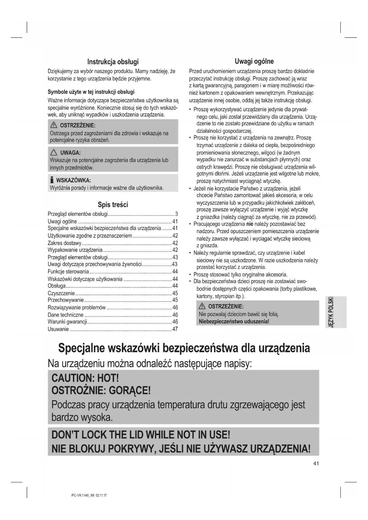 - Dla bezpieczeństwa dzieci proszę nie zostawiać swo- bodnie dostępnych części opakowania (torby plastikowe, kartony, styropian itp.). OSTRZEŻENIE: Nie pozwalaj dzieciom bawić się folią. Niebezpieczeństwo uduszenia! Specjalne wskazówki bezpieczeństwa dla urządzenia Na urządzeniu można odnaleźć następujące napisy: CAUTION: HOT! OSTROŻNIE: GORĄCE! Podczas pracy urządzenia temperatura drutu zgrzewającego jest bardzo wysoka. DON’T LOCK THE LID WHILE NOT IN USE! NIE BLOKUJ POKRYWY, JEŚLI NIE UŻYWASZ URZĄDZENIA!PC-VK1146_IM 02.11.17