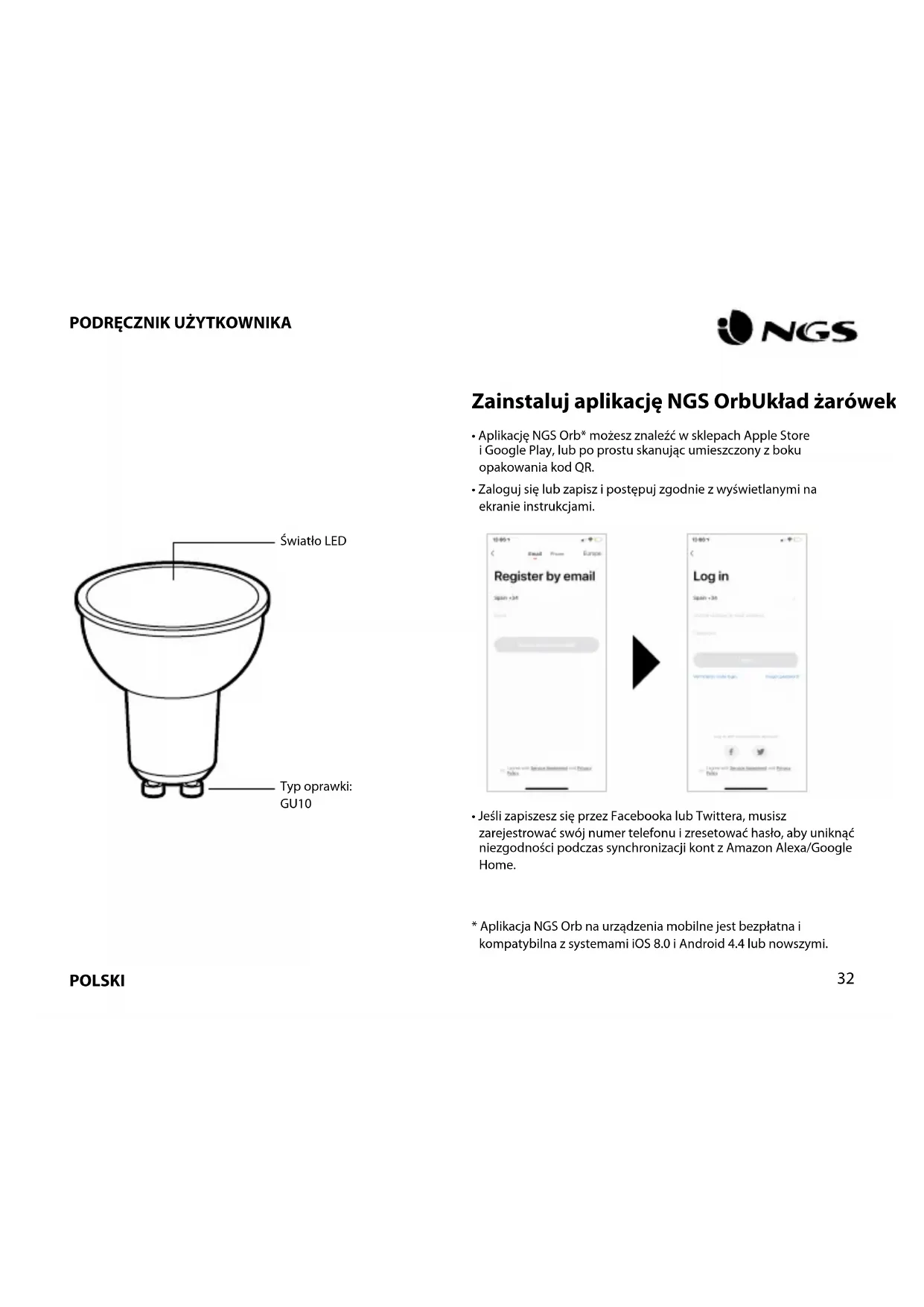 - JeślizapiszeszsięprzezFacebookalubTwittera,musisz zarejestrowaćswójnumertelefonuizresetowaćhasło,abyuniknąć niezgodnościpodczassynchronizacjikontzAmazonAlexa/Google Home. *AplikacjaNGSOrbnaurządzeniamobilnejestbezpłatnai kompatybilnazsystemamiiOS8.0iAndroid4.4lubnowszymi. Typoprawki: GU10 ŚwiatłoLEDPOLSKI