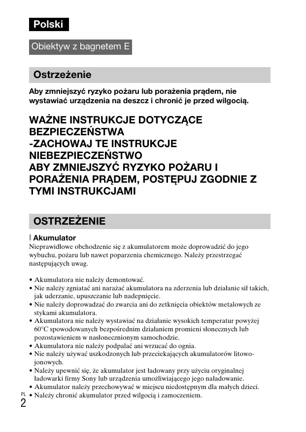 PORAŻENIA PRĄDEM, POSTĘPUJ ZGODNIE Z TYMI INSTRUKCJAMI OSTRZEŻENIE [ Akumulator Nieprawidłowe obchodzenie się z akumulatorem może doprowadzić do jego wybuchu, pożaru lub nawet poparzenia chemicznego. Należy przestrzegać następujących uwag.