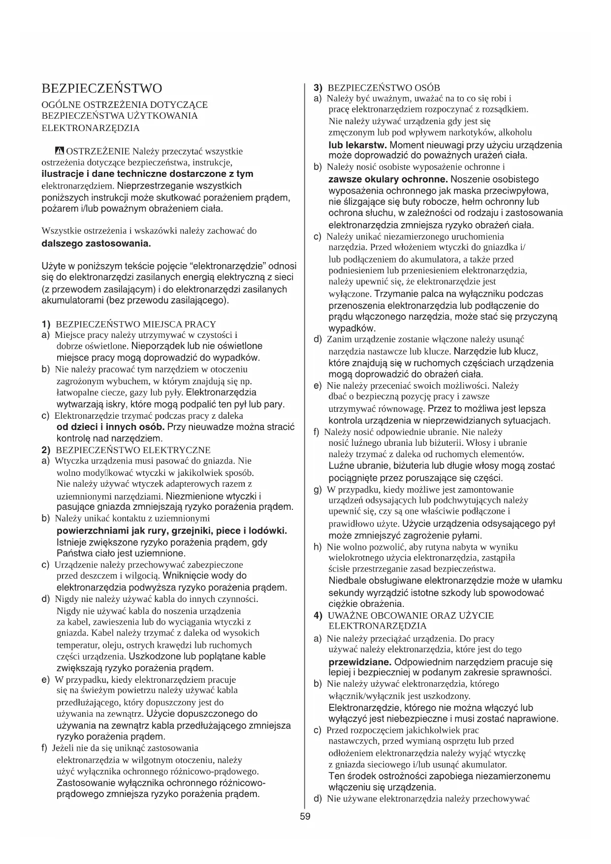 ELEKTRONARZĘDZIA - OSTRZEŻENIE Należy przeczytać wszystkie ostrzeżenia dotyczące bezpieczeństwa, instrukcje, ilustracje i dane techniczne dostarczone z tym elektronarzędziem. Nieprzestrzeganie wszystkich poniższych instrukcji może skutkować porażeniem prądem, pożarem i/lub poważnym obrażeniem ciała. Wszystkie ostrzeżenia i wskazówki należy zachować do dalszego zastosowania. Użyte w poniższym tekście pojęcie “elektronarzędzie” odnosi się do elektronarzędzi zasilanych energią elektryczną z sieci (z przewodem zasilającym) i do elektronarzędzi zasilanych akumulatorami (bez przewodu zasilającego).