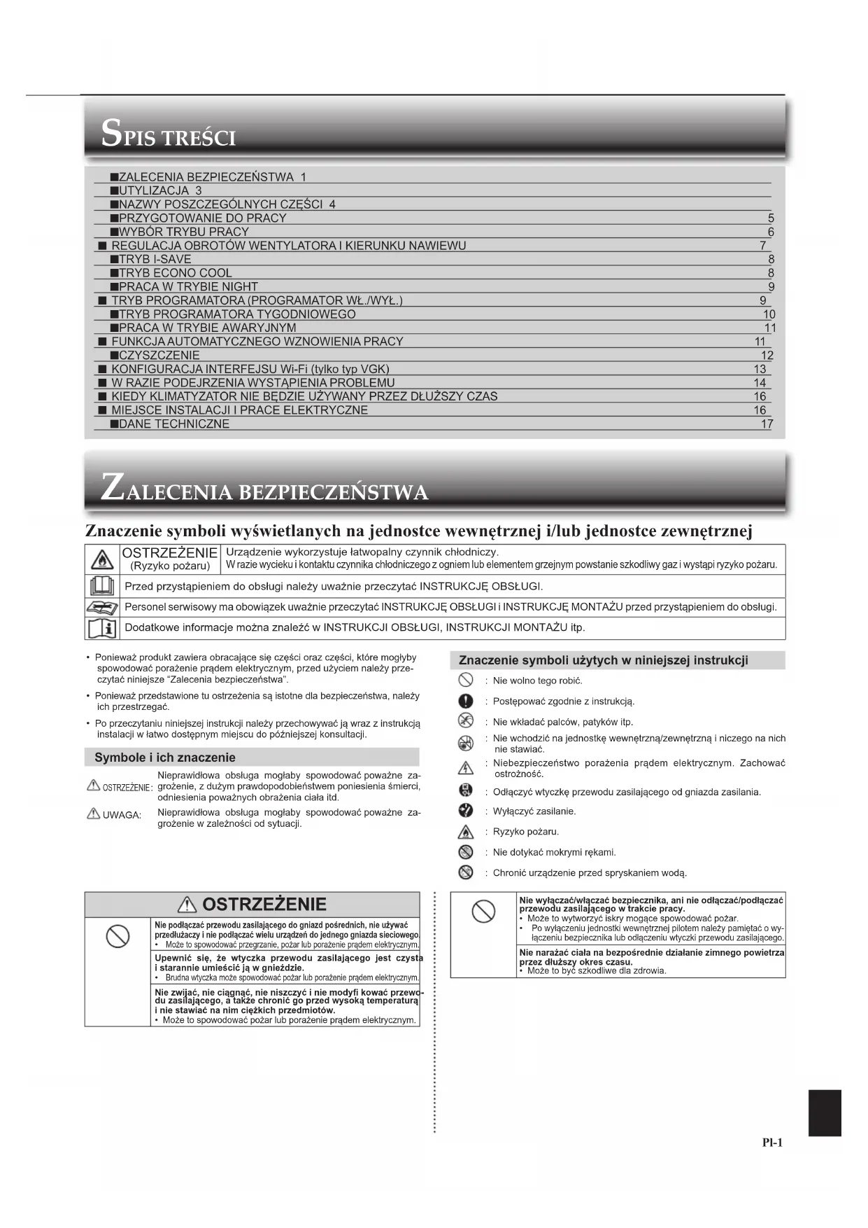 JG79Y259H03_bg.indd 17 2017/10/12 14:14:25Pl-1 OSTRZEŻENIE Nie podłączać przewodu zasilającego do gniazd pośrednich, nie używać przedłużaczy i nie podłączać wielu urządzeń do jednego gniazda sieciowego. Może to spowodować przegrzanie, pożar lub porażenie prądem elektrycznym.Upewnić się, że wtyczka przewodu zasilającego jest czysta i starannie umieścić ją w gnieździe. Brudna wtyczka może spowodować pożar lub porażenie prądem elektrycznym.Nie zwijać, nie ciągnąć, nie niszczyć i nie modyfi kować przewo-du zasilającego, a także chronić go przed wysoką temperaturą i nie stawiać na nim ciężkich przedmiotów.• Może to spowodować pożar lub porażenie prądem elektrycznym.• Ponieważ produkt zawiera obracające się części oraz części, które mogłyby spowodować porażenie prądem elektrycznym, przed użyciem należy prze-czytać niniejsze “Zalecenia bezpieczeństwa”.• Ponieważ przedstawione tu ostrzeżenia są istotne dla bezpieczeństwa, należy ich przestrzegać.• Po przeczytaniu niniejszej instrukcji należy przechowywać ją wraz z instrukcją instalacji w łatwo dostępnym miejscu do późniejszej konsultacji. Symbole i ich znaczenie OSTRZEŻENIE Nieprawidłowa obsługa mogłaby spowodować poważne za-grożenie, z dużym prawdopodobieństwem poniesienia śmierci, odniesienia poważnych obrażenia ciała itd. UWAGA:Nieprawidłowa obsługa mogłaby spowodować poważne za-grożenie w zależności od sytuacji. Znaczenie symboli użytych w niniejszej instrukcji : Nie wolno tego robić. : Postępować zgodnie z instrukcją. : Nie wkładać palców, patyków itp. : Nie wchodzić na jednostkę wewnętrzną/zewnętrzną i niczego na nich nie stawiać. : Niebezpieczeństwo porażenia prądem elektrycznym. Zachować ostrożność. : Odłączyć wtyczkę przewodu zasilającego od gniazda zasilania. : Wyłączyć zasilanie. : Ryzyko pożaru. : Nie dotykać mokrymi rękami. : Chronić urządzenie przed spryskaniem wodą.