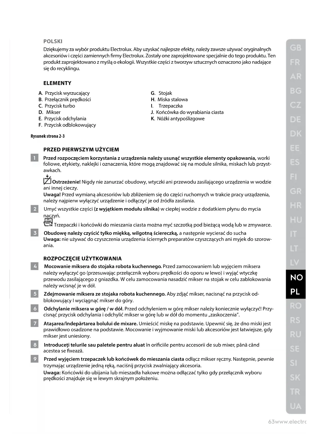 POLSKI Dziękujemy za wybór produktu Electrolux. Aby uzyskać najlepsze efekty, należy zawsze używać oryginalnych akcesoriów i części zamiennych rmy Electrolux. Zostały one zaprojektowane specjalnie do tego produktu. Ten produkt zaprojektowano z myślą o ekologii. Wszystkie części z tworzyw sztucznych oznaczono jako nadające się do recyklingu. ELEMENTY A. Przycisk wyrzucający B. Przełącznik prędkości C. Przycisk turbo D. Mikser E. Przycisk odchylania F. Przycisk odblokowujący G. Stojak H. Miska stalowa