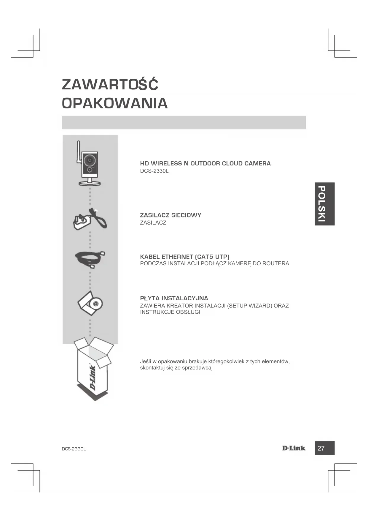 YTA INSTAlACYJNA ZAWIERA KREATOR INSTALACJI (SETUP WIZARD) ORAZ INSTRUKCJE OBSŁUGI HD WIrElESS N OuTDOOr ClOuD CAmErA DCS-2330L ZASIlACZ SIECIOWY ZASILACZ KABEl ETHErNET (CAT5 uTP) PODCZAS INSTALACJI PODŁĄCZ KAMERĘ DO ROUTERAJeśli w opakowaniu brakuje któregokolwiek z tych elementów, skontaktuj się ze sprzedawcąDCS-2330L