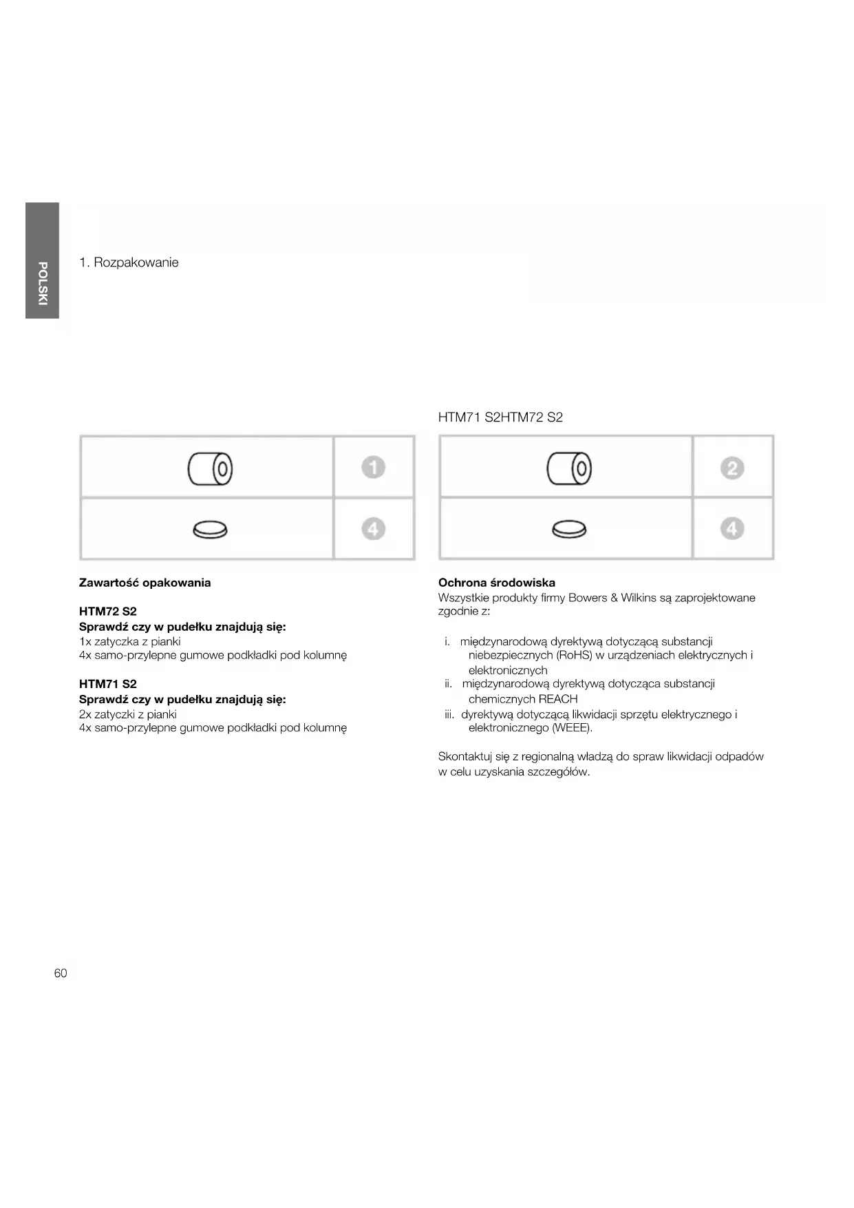 Zawartość opakowania HTM72S2 Sprawdź czy w pudełku znajdują się: 1x zatyczka z pianki 4x samo-przylepne gumowe podkładki pod kolumnę HTM71S2 Sprawdź czy w pudełku znajdują się: 2x zatyczki z pianki 4x samo-przylepne gumowe podkładki pod kolumnę Ochrona środowiska Wszystkie produkty rmy Bowers & Wilkins są zaprojektowane zgodnie z: