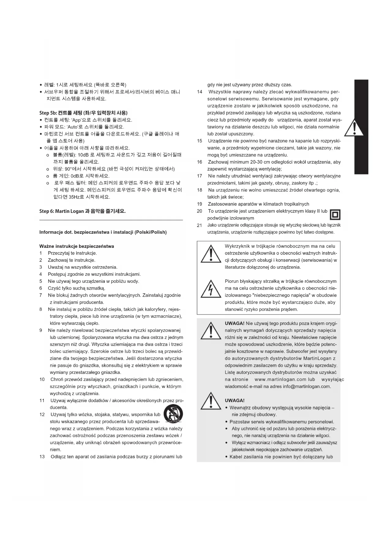 - 어플을 사용하며 아래 사항을 따라하세요. o 볼륨(레벨): 10dB 로 세팅하고 사운드가 깊고 저음이 길어질때 까지 볼륨을 올리세요. o 위상: 90°에서 시작하세요 (바뀐 극성이 켜져있는 상태에서) o 룸 게인: 0dB로 시작하세요. o 로우 패스 필터: 메인 스피커의 로우앤드 주파수 응답 보다 낮 게 세팅 하세요. 메인스피커의 로우앤드 주파수 응답에 확신이 없다면 35Hz로 시작하세요. Step 6: Martin Logan 과 음악을 즐기세요. Informacje dot. bezpieczeństwa i instalacji (Polski/Polish) Ważne instrukcje bezpieczeństwa 1 Przeczytajteinstrukcje. 2 Zachowajteinstrukcje. 3 Uważajnawszystkieostrzeżenia. 4 Postępujzgodniezewszystkimiinstrukcjami. 5 Nieużywajtegourządzeniawpobliżuwody. 6 Czyśćtylkosuchąszmatką. 7 Nieblokujżadnychotworówwentylacyjnych.Zainstalujzgodnie zinstrukcjamiproducenta. 8 Nieinstalujwpobliżuźródełciepła,takichjakkaloryfery,rejes- tratoryciepła,piecelubinneurządzenia(wtymwzmacniacze), którewytwarzająciepło. 9 Nienależyniwelowaćbezpieczeństwawtyczkispolaryzowanej lubuziemionej.Spolaryzowanawtyczkamadwaostrzazjednym szerszymniżdrugi.Wtyczkauziemiającamadwaostrzaitrzeci bolecuziemiający.Szerokieostrzelubtrzecibolecsąprzewid- zianedlatwojegobezpieczeństwa.Jeślidostarczonawtyczka niepasujedogniazdka,skonsultujsięzelektrykiemwsprawie wymianyprzestarzałegogniazdka. 10 Chrońprzewódzasilającyprzednadepnięciemlubzgnieceniem, szczególnieprzywtyczkach,gniazdkachipunkcie,wktórym wychodzązurządzenia. 11 Używajwyłączniedodatków/akcesoriówokreślonychprzezpro- ducenta. 12 Używajtylkowózka,stojaka,statywu,wspornikalub stołuwskazanegoprzezproducentalubsprzedawa- negowrazzurządzeniem.Podczaskorzystaniazwózkanależy zachowaćostrożnośćpodczasprzenoszeniazestawuwózek/ urządzenie,abyuniknąćobrażeńspowodowanychprzewróce- niem. 13 Odłącztenaparatodzasilaniapodczasburzyzpiorunamilub gdyniejestużywanyprzezdłuższyczas. 14 Wszystkienaprawynależyzlecaćwykwalifikowanemuper- sonelowiserwisowemu.Serwisowaniejestwymagane,gdy urządzeniezostałowjakikolwieksposóbuszkodzone,na przykładprzewódzasilającylubwtyczkasąuszkodzone,rozlana cieczlubprzedmiotywpadłydourządzenia,aparatzostałwys- tawionynadziałaniedeszczulubwilgoci,niedziałanormalnie lubzostałupuszczony. 15 Urządzenieniepowinnobyćnarażonenakapanielubrozpryski- wanie,aprzedmiotywypełnionecieczami,takiejakwazony,nie mogąbyćumieszczanenaurządzeniu. 16 Zachowajminimum20-30cmodległościwokółurządzenia,aby zapewnićwystarczającąwentylację; 17 Nienależyutrudniaćwentylacjizakrywającotworywentylacyjne przedmiotami,takimijakgazety,obrusy,zasłonyitp.; 18 Naurządzeniuniewolnoumieszczaćźródełotwartegoognia, takichjakświece; 19 Zastosowanieaparatówwklimatachtropikalnych 20 TourządzeniejesturządzeniemelektrycznymklasyIIlub podwójnieizolowanym