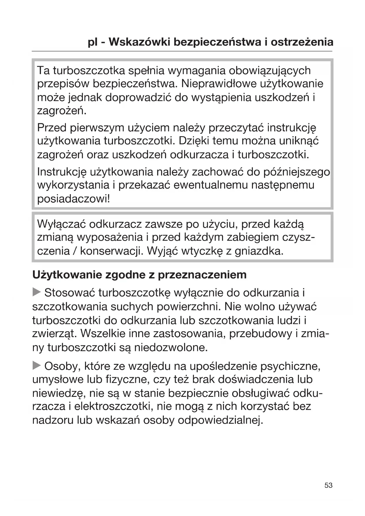 Ta turboszczotka spełnia wymagania obowiązujących przepisów bezpieczeństwa. Nieprawidłowe użytkowanie może jednak doprowadzić do wystąpienia uszkodzeń i zagrożeń. Przed pierwszym użyciem należy przeczytać instrukcję użytkowania turboszczotki. Dzięki temu można uniknąć zagrożeń oraz uszkodzeń odkurzacza i turboszczotki. Instrukcję użytkowania należy zachować do późniejszego wykorzystania i przekazać ewentualnemu następnemu posiadaczowi! Wyłączać odkurzacz zawsze po użyciu, przed każdą zmianą wyposażenia i przed każdym zabiegiem czysz- czenia / konserwacji. Wyjąć wtyczkę z gniazdka. Użytkowanie zgodne z przeznaczeniem Stosować turboszczotkę wyłącznie do odkurzania i szczotkowania suchych powierzchni. Nie wolno używać turboszczotki do odkurzania lub szczotkowania ludzi i zwierząt. Wszelkie inne zastosowania, przebudowy i zmia- ny turboszczotki są niedozwolone. Osoby, które ze względu na upośledzenie psychiczne, umysłowe lub fizyczne, czy też brak doświadczenia lub niewiedzę, nie są w stanie bezpiecznie obsługiwać odku- rzacza i elektroszczotki, nie mogą z nich korzystać bez nadzoru lub wskazań osoby odpowiedzialnej.pl - Wskazówki bezpieczeństwa i ostrzeżenia