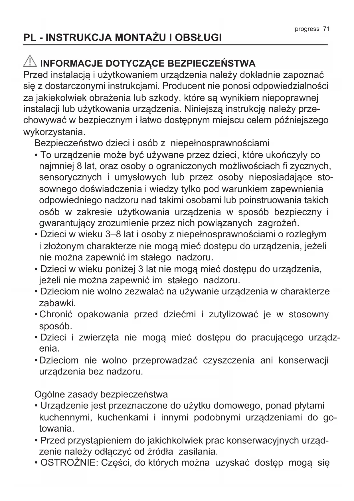 - Nie używać urządzenia do usuwania materiałów i oparów substancji niebezpiecznych lub wybuchowych.progress 73