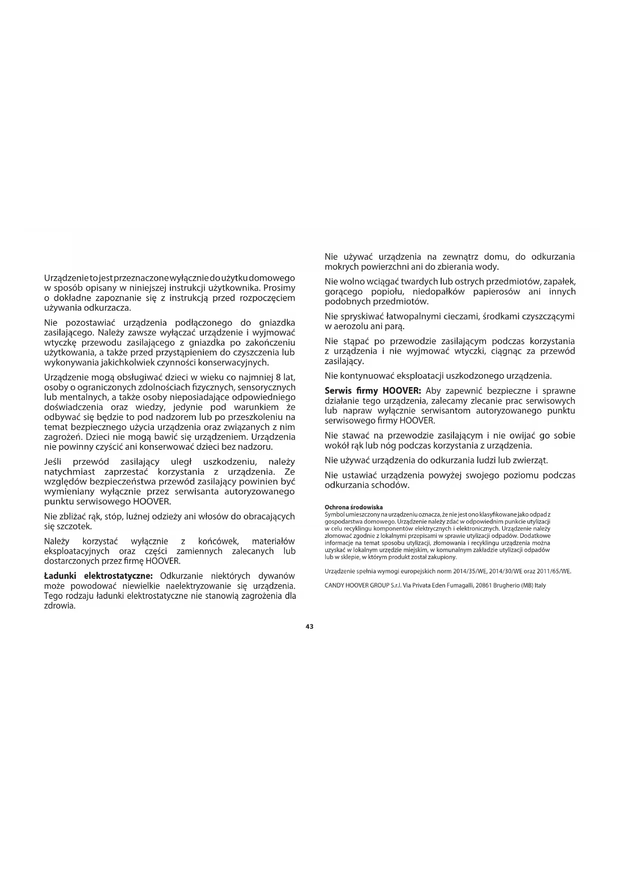 - Μήπως υπερθερμάνθηκε η σκούπα; Εάν ναι, η αυτόματη επαναφορά θα διαρκέσει περίπου 30 λεπτά.INSTRUKCJE BEZPIECZNEGO UŻYTKOWANIA Urządzenie to jest przeznaczone wyłącznie do użytku domowego w sposób opisany w niniejszej instrukcji użytkownika. Prosimy o dokładne zapoznanie się z instrukcją przed rozpoczęciem używania odkurzacza. Nie pozostawiać urządzenia podłączonego do gniazdka zasilającego. Należy zawsze wyłączać urządzenie i wyjmować wtyczkę przewodu zasilającego z gniazdka po zakończeniu użytkowania, a także przed przystąpieniem do czyszczenia lub wykonywania jakichkolwiek czynności konserwacyjnych. Urządzenie mogą obsługiwać dzieci w wieku co najmniej 8 lat, osoby o ograniczonych zdolnościach zycznych, sensorycznych lub mentalnych, a także osoby nieposiadające odpowiedniego doświadczenia oraz wiedzy, jedynie pod warunkiem że odbywać się będzie to pod nadzorem lub po przeszkoleniu na temat bezpiecznego użycia urządzenia oraz związanych z nim zagrożeń. Dzieci nie mogą bawić się urządzeniem. Urządzenia nie powinny czyścić ani konserwować dzieci bez nadzoru. Jeśli przewód zasilający uległ uszkodzeniu, należy natychmiast zaprzestać korzystania z urządzenia. Ze względów bezpieczeństwa przewód zasilający powinien być wymieniany wyłącznie przez serwisanta autoryzowanego punktu serwisowego HOOVER. Nie zbliżać rąk, stóp, luźnej odzieży ani włosów do obracających się szczotek. Należy korzystać wyłącznie z końcówek, materiałów eksploatacyjnych oraz części zamiennych zalecanych lub dostarczonych przez rmę HOOVER. Ładunki elektrostatyczne: Odkurzanie niektórych dywanów może powodować niewielkie naelektryzowanie się urządzenia. Tego rodzaju ładunki elektrostatyczne nie stanowią zagrożenia dla zdrowia. Nie używać urządzenia na zewnątrz domu, do odkurzania mokrych powierzchni ani do zbierania wody. Nie wolno wciągać twardych lub ostrych przedmiotów, zapałek, gorącego popiołu, niedopałków papierosów ani innych podobnych przedmiotów. Nie spryskiwać łatwopalnymi cieczami, środkami czyszczącymi w aerozolu ani parą. Nie stąpać po przewodzie zasilającym podczas korzystania z urządzenia i nie wyjmować wtyczki, ciągnąc za przewód zasilający. Nie kontynuować eksploatacji uszkodzonego urządzenia. Serwis rmy HOOVER: Aby zapewnić bezpieczne i sprawne działanie tego urządzenia, zalecamy zlecanie prac serwisowych lub napraw wyłącznie serwisantom autoryzowanego punktu serwisowego rmy HOOVER. Nie stawać na przewodzie zasilającym i nie owijać go sobie wokół rąk lub nóg podczas korzystania z urządzenia. Nie używać urządzenia do odkurzania ludzi lub zwierząt. Nie ustawiać urządzenia powyżej swojego poziomu podczas odkurzania schodów. Ochrona środowiska Symbol umieszczony na urządzeniu oznacza, że nie jest ono klasykowane jako odpad z gospodarstwa domowego. Urządzenie należy zdać w odpowiednim punkcie utylizacji w celu recyklingu komponentów elektrycznych i elektronicznych. Urządzenie należy złomować zgodnie z lokalnymi przepisami w sprawie utylizacji odpadów. Dodatkowe informacje na temat sposobu utylizacji, złomowania i recyklingu urządzenia można uzyskać w lokalnym urzędzie miejskim, w komunalnym zakładzie utylizacji odpadów lub w sklepie, w którym produkt został zakupiony. Urządzenie spełnia wymogi europejskich norm 2014/35/WE, 2014/30/WE oraz 2011/65/WE. CANDY HOOVER GROUP S.r.l. Via Privata Eden Fumagalli, 20861 Brugherio (MB) Italy