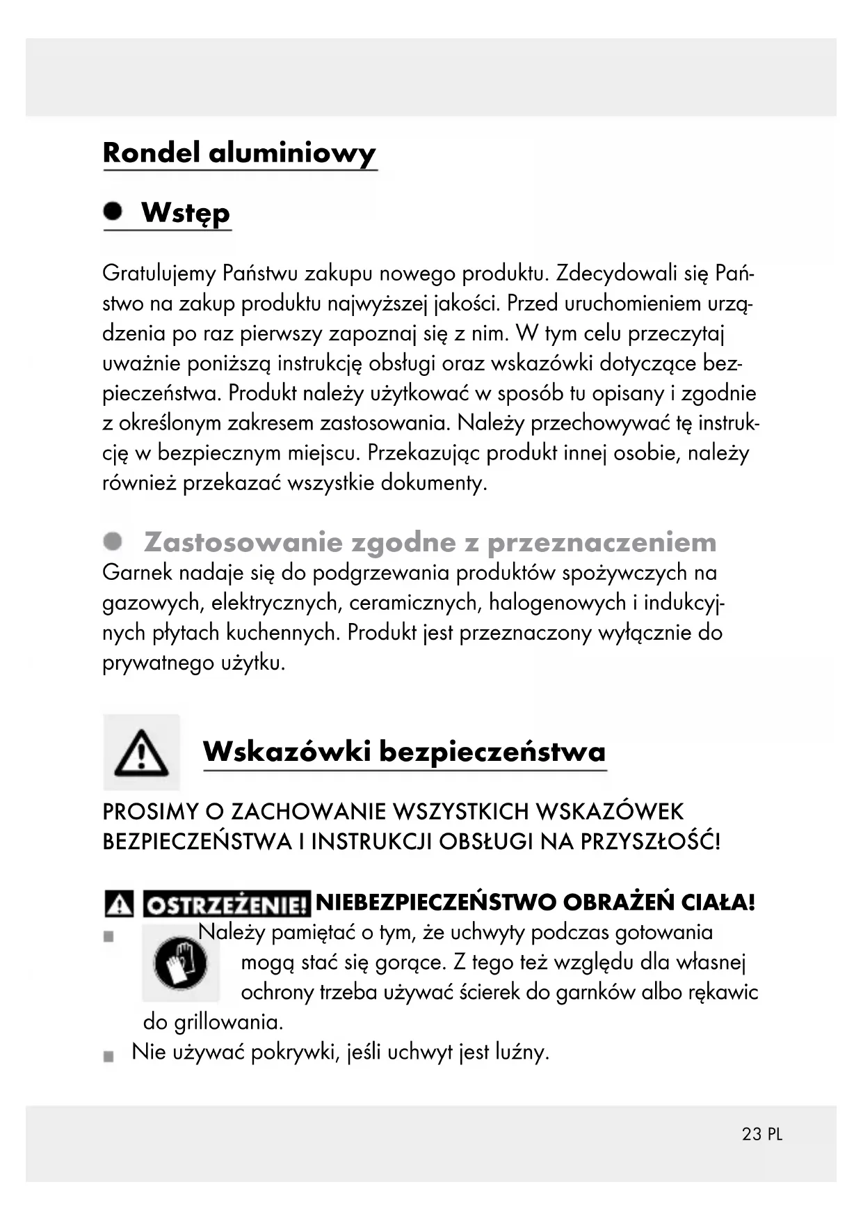 BEZPIECZEŃSTWA I INSTRUKCJI OBSŁUGI NA PRZYSZŁOŚĆ! NIEBEZPIECZEŃSTWO OBRAŻEŃ CIAŁA! Należy pamiętać o tym, że uchwyty podczas gotowania mogą stać się gorące. Z tego też względu dla własnej ochrony trzeba używać ścierek do garnków albo rękawic do grillowania. Nie używać pokrywki, jeśli uchwyt jest luźny.24 PL Nie należy używać garnka, kiedy uchwyty są luźne. W razie potrzeby należy dokręcić uchwyty.