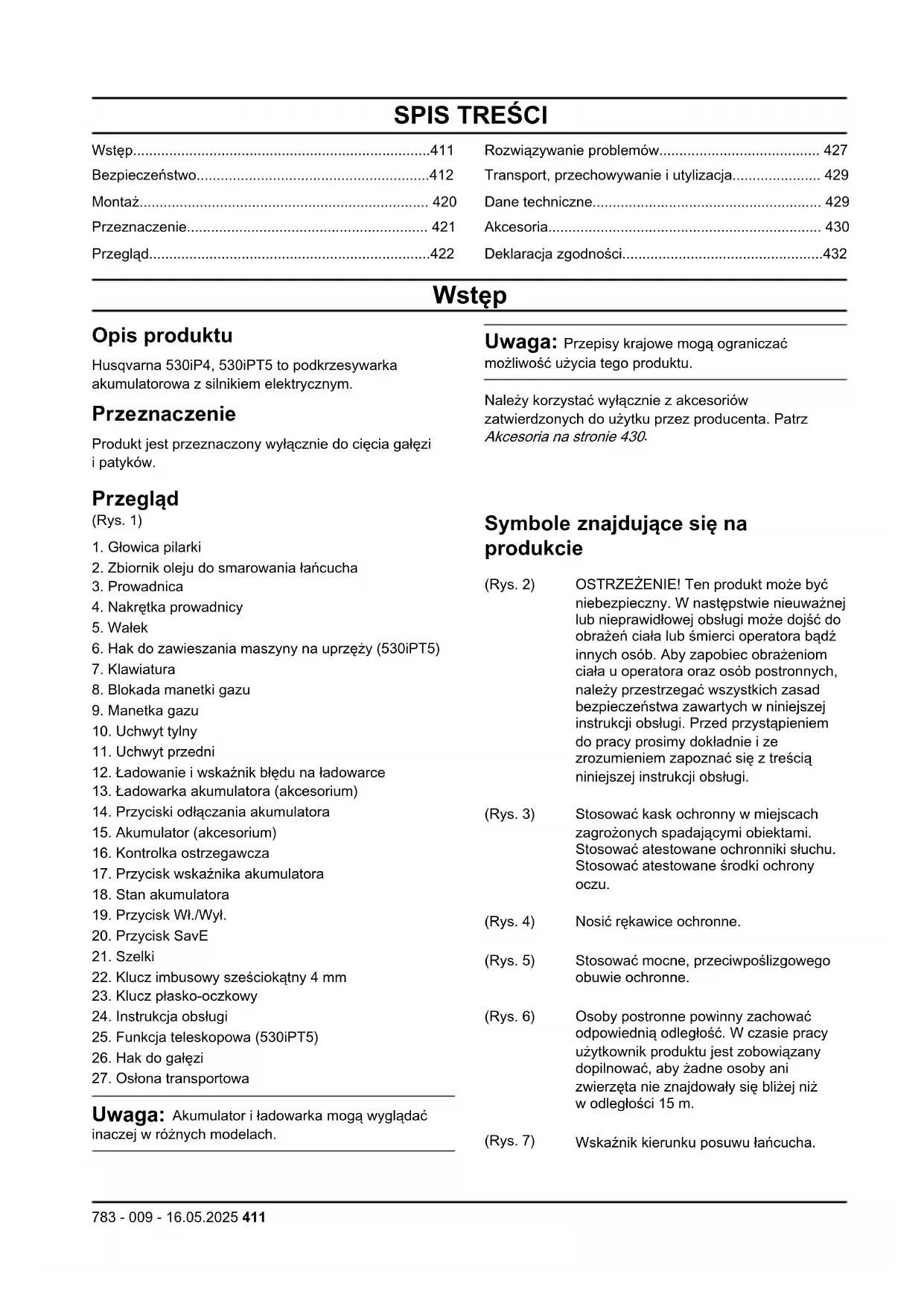 - Deklaracja zgodności Wstęp Opis produktu Husqvarna 530iP4, 530iPT5 to podkrzesywarka akumulatorowa z silnikiem elektrycznym. Przeznaczenie Produkt jest przeznaczony wyłącznie do cięcia gałęzi i patyków. Uwaga: Przepisy krajowe mogą ograniczać możliwość użycia tego produktu. Należy korzystać wyłącznie z akcesoriów zatwierdzonych do użytku przez producenta. Patrz Akcesoria na stronie 430 p. 432