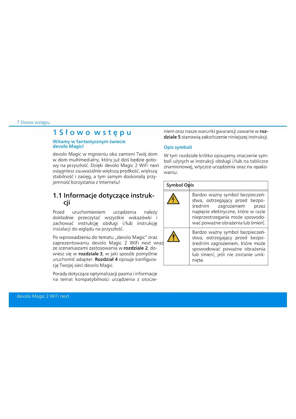 - 5.5 Ogólne warunki gwarancji Słowo wstępu devolo Magic 2 WiFi next 1Słowo wstępu Witamy w fantastycznym świecie devolo Magic! devolo Magic w mgnieniu oka zamieni Twój dom w dom multimedialny, który już dziś będzie goto- wy na przyszłość. Dzięki devolo Magic 2 WiFi next osiągniesz zauważalnie większą prędkość, większą stabilność i zasięg, a tym samym doskonałą przy- jemność korzystania z Internetu! p. 587