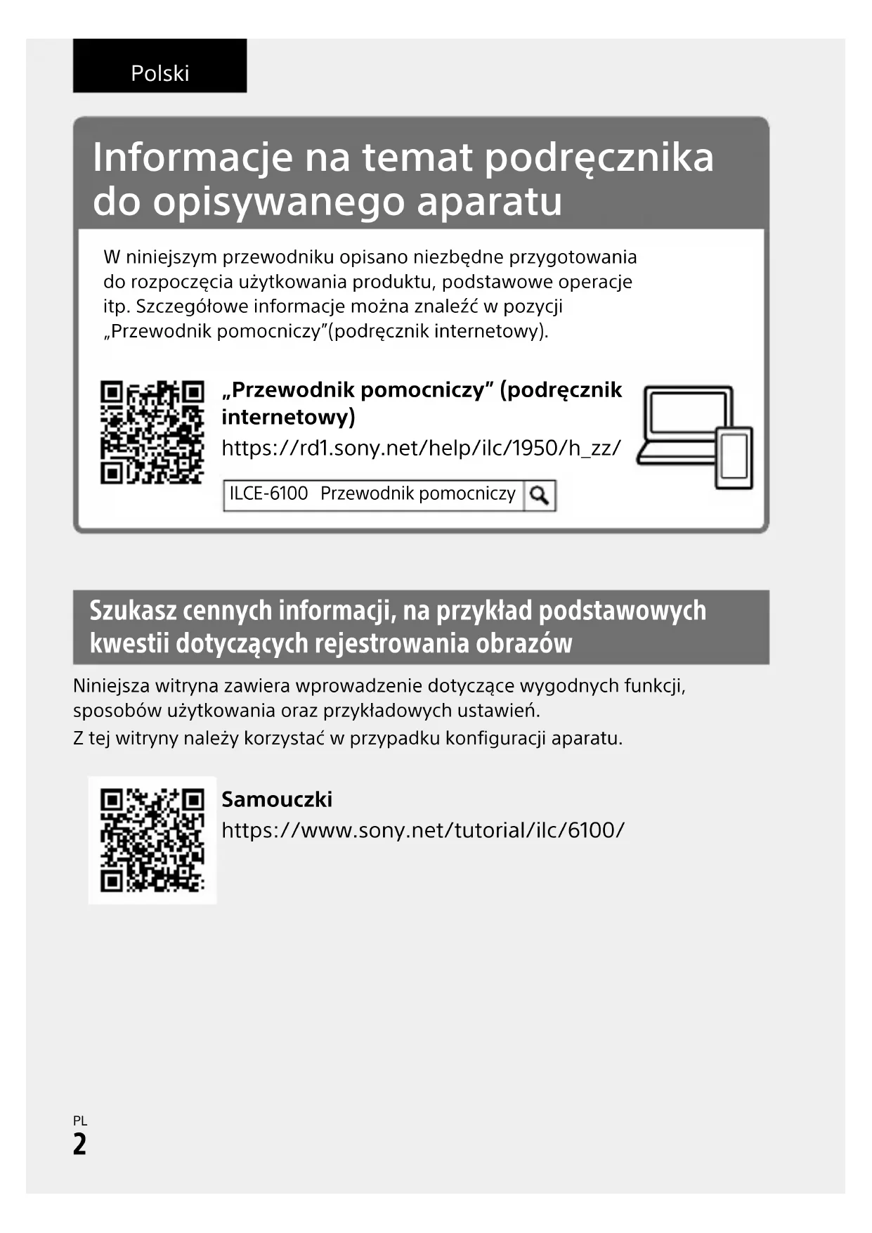 \\Win-473\camera\CX88400(PD)\Multi\06_Compose\5009876411_14lang\5009876411ILCE6100CEC\08PL-ILCE6100CEC\08PL.indd DTP data saved: 2019/07/24 09:13 PDF file created: 2019/07/31 09:19 Informacje na temat podręcznika do opisywanego aparatu W niniejszym przewodniku opisano niezbędne przygotowania do rozpoczęcia użytkowania produktu, podstawowe operacje itp. Szczegółowe informacje można znaleźć w pozycji „Przewodnik pomocniczy”(podręcznik internetowy). https://rd1.sony.net/help/ilc/1950/h_zz/ „Przewodnik pomocniczy” (podręcznik internetowy) ILCE-6100 Przewodnik pomocniczy Szukasz cennych informacji, na przykład podstawowych kwestii dotyczących rejestrowania obrazów Niniejsza witryna zawiera wprowadzenie dotyczące wygodnych funkcji, sposobów użytkowania oraz przykładowych ustawień.Z tej witryny należy korzystać w przypadku konfiguracji aparatu. Samouczki https://www.sony.net/tutorial/ilc/6100/ PolskiILCE-61005-009-876-41(1)
