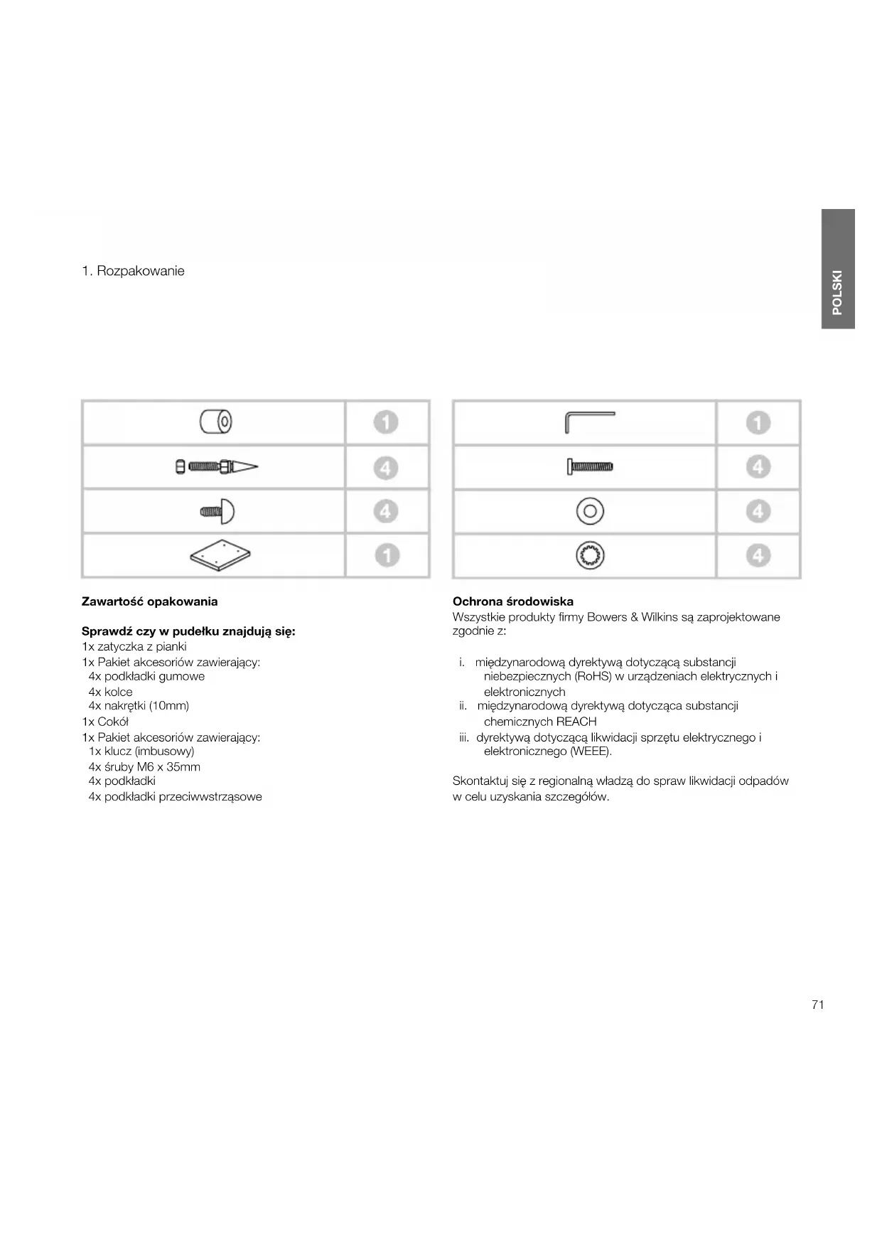 Zawartość opakowania Sprawdź czy w pudełku znajdują się: 1x zatyczka z pianki 1x Pakiet akcesoriów zawierający: 4x podkładki gumowe 4x kolce 4x nakrętki (10mm) 1x Cokół 1x Pakiet akcesoriów zawierający: 1x klucz (imbusowy) 4x śruby M6 x 35mm 4x podkładki 4x podkładki przeciwwstrząsowe Ochrona środowiska Wszystkie produkty rmy Bowers & Wilkins są zaprojektowane zgodnie z: