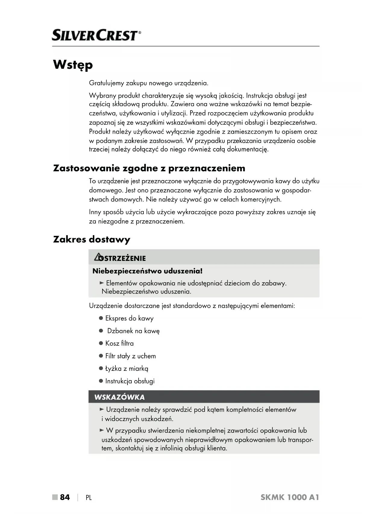 PL SKMK 1000 A1 Wstęp Gratulujemy zakupu nowego urządzenia. Wybrany produkt charakteryzuje się wysoką jakością. Instrukcja obsługi jest częścią składową produktu. Zawiera ona ważne wskazówki na temat bezpie- czeństwa, użytkowania i utylizacji. Przed rozpoczęciem użytkowania produktu zapoznaj się ze wszystkimi wskazówkami dotyczącymi obsługi i bezpieczeństwa. Produkt należy użytkować wyłącznie zgodnie zzamieszczonym tu opisem oraz wpodanym zakresie zastosowań. Wprzypadku przekazania urządzenia osobie trzeciej należy dołączyć do niego również całą dokumentację. Zastosowanie zgodne z przeznaczeniem To urządzenie jest przeznaczone wyłącznie do przygotowywania kawy do użytku domowego. Jest ono przeznaczone wyłącznie do zastosowania w gospodar- stwach domowych. Nie należy używać go w celach komercyjnych. Inny sposób użycia lub użycie wykraczające poza powyższy zakres uznaje się za niezgodne zprzeznaczeniem. Zakres dostawy OSTRZEŻENIE Niebezpieczeństwo uduszenia! ► Elementów opakowania nie udostępniać dzieciom do zabawy. Niebezpieczeństwo uduszenia. Urządzenie dostarczane jest standardowo znastępującymi elementami: ▯ Ekspres do kawy ▯ Dzbanek na kawę ▯ Kosz filtra ▯ Filtr stały z uchem ▯ Łyżka z miarką ▯ Instrukcja obsługi WSKAZÓWKA ► Urządzenie należy sprawdzić pod kątem kompletności elementów i widocznych uszkodzeń. ► W przypadku stwierdzenia niekompletnej zawartości opakowania lub uszkodzeń spowodowanych nieprawidłowym opakowaniem lub transpor- tem, skontaktuj się z infolinią obsługi klienta.PL