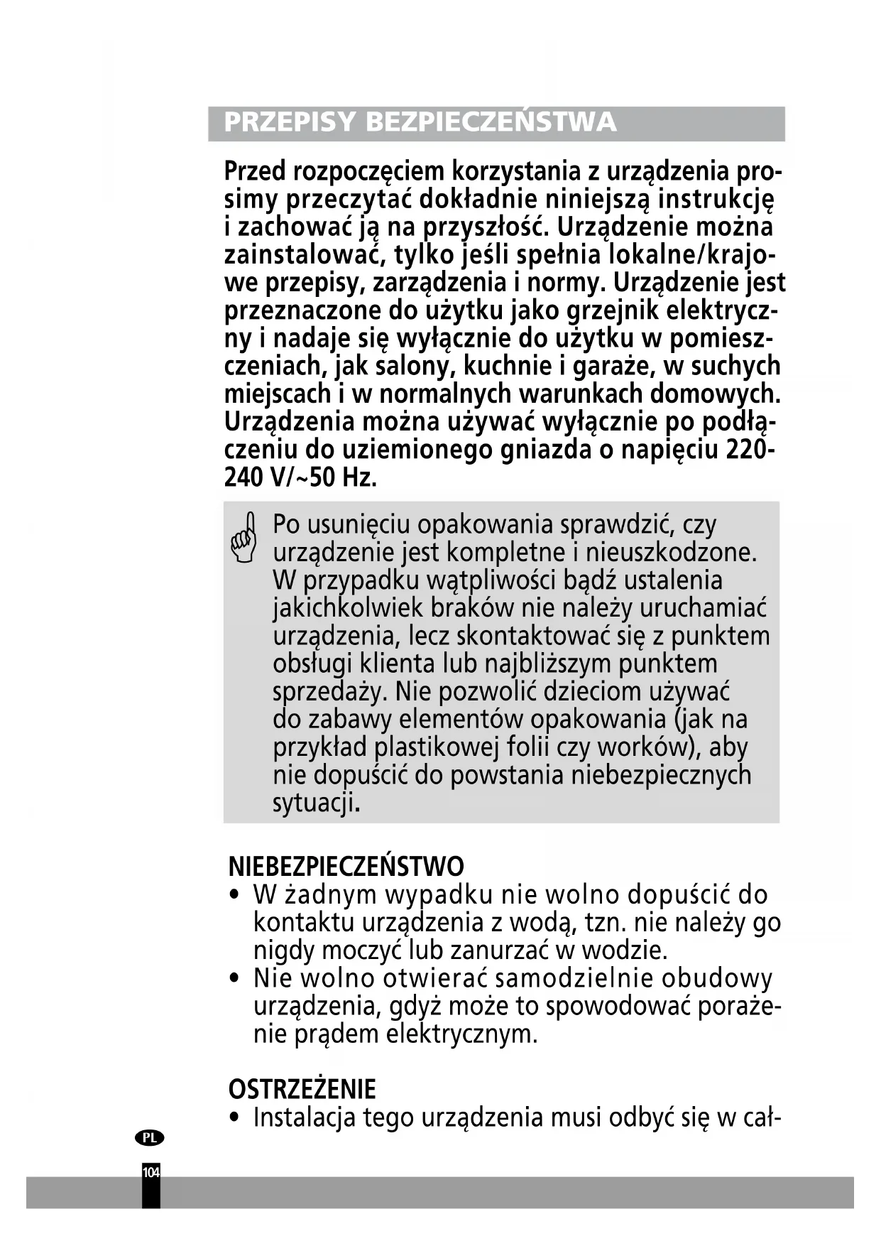 Przed rozpoczęciem korzystania z urządzenia pro- simy przeczytać dokładnie niniejszą instrukcję i zachować ją na przyszłość. Urządzenie można zainstalować, tylko jeśli spełnia lokalne/krajo- we przepisy, zarządzenia i normy. Urządzenie jest przeznaczone do użytku jako grzejnik elektrycz- ny i nadaje się wyłącznie do użytku w pomiesz- czeniach, jak salony, kuchnie i garaże, w suchych miejscach i w normalnych warunkach domowych. Urządzenia można używać wyłącznie po podłą- czeniu do uziemionego gniazda o napięciu 220- 240 V/~50 Hz.