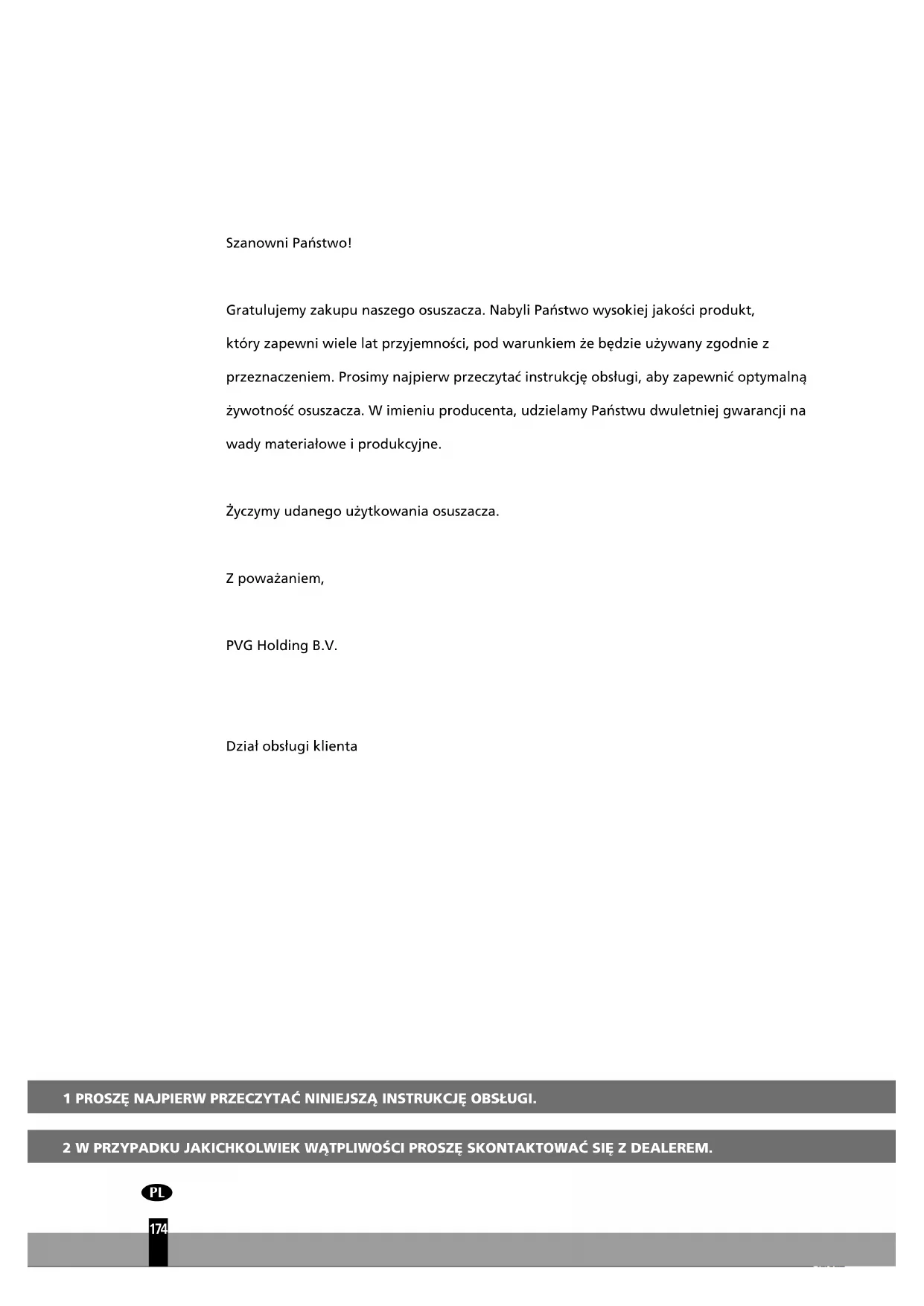 Szanowni Państwo! Gratulujemy zakupu naszego osuszacza. Nabyli Państwo wysokiej jakości produkt, który zapewni wiele lat przyjemności, pod warunkiem że będzie używany zgodnie z przeznaczeniem. Prosimy najpierw przeczytać instrukcję obsługi, aby zapewnić optymalną żywotność osuszacza. W imieniu producenta, udzielamy Państwu dwuletniej gwarancji na wady materiałowe i produkcyjne. Życzymy udanego użytkowania osuszacza. Z poważaniem, PVG Holding B.V. Dział obsługi klienta175 1 LEES EERST DE GEBRUIKSAANWIJZING. 2 RAADPLEEG BIJ TWIJFEL UW DEALER. WAŻNE PODZESPOŁY Skorupa przednia Wylot Uchwyt Panel sterowniczy Skrzynka filtracyjna Skorupa tylna Zbiornik Gumowe nóżki Przewód zasilający