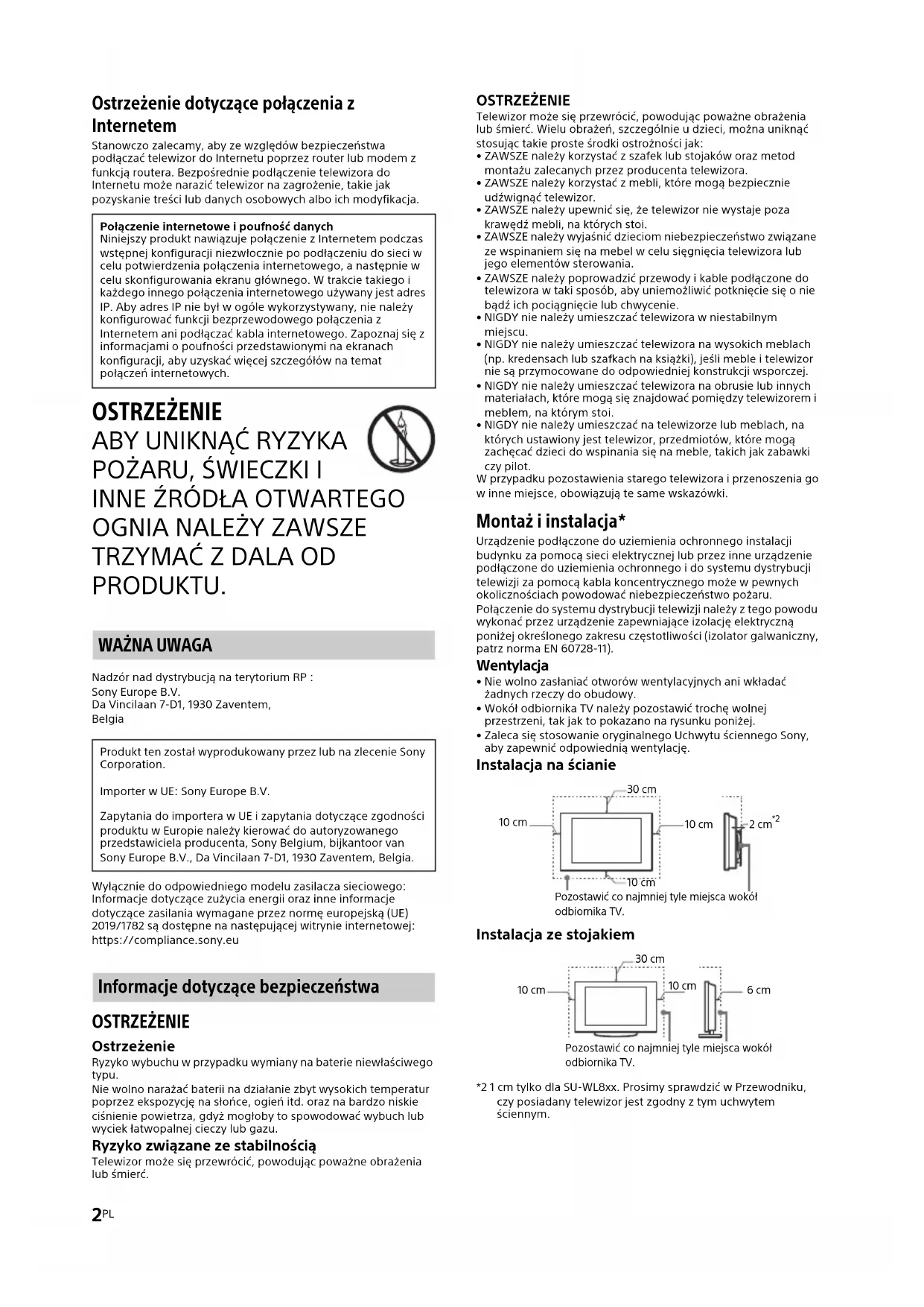 - Zaleca się stosowanie oryginalnego Uchwytu ściennego Sony, aby zapewnić odpowiednią wentylację. Instalacja na ścianie Instalacja ze stojakiem *2 1 cm tylko dla SU-WL8xx. Prosimy sprawdzić w Przewodniku, czy posiadany telewizor jest zgodny z tym uchwytem ściennym. Połączenie internetowe i poufność danych Niniejszy produkt nawiązuje połączenie z Internetem podczas wstępnej konfiguracji niezwłocznie po podłączeniu do sieci w celu potwierdzenia połączenia internetowego, a następnie w celu skonfigurowania ekranu głównego. W trakcie takiego i każdego innego połączenia internetowego używany jest adres IP. Aby adres IP nie był w ogóle wykorzystywany, nie należy konfigurować funkcji bezprzewodowego połączenia z Internetem ani podłączać kabla internetowego. Zapoznaj się z informacjami o poufności przedstawionymi na ekranach konfiguracji, aby uzyskać więcej szczegółów na temat połączeń internetowych. Produkt ten został wyprodukowany przez lub na zlecenie Sony Corporation. Importer w UE: Sony Europe B.V. Zapytania do importera w UE i zapytania dotyczące zgodności produktu w Europie należy kierować do autoryzowanego przedstawiciela producenta, Sony Belgium, bijkantoor van Sony Europe B.V., Da Vincilaan 7-D1, 1930 Zaventem, Belgia. 30 cm 10 cm 10 cm Pozostawić co najmniej tyle miejsca wokół odbiornika TV. 10 cm 2 cm