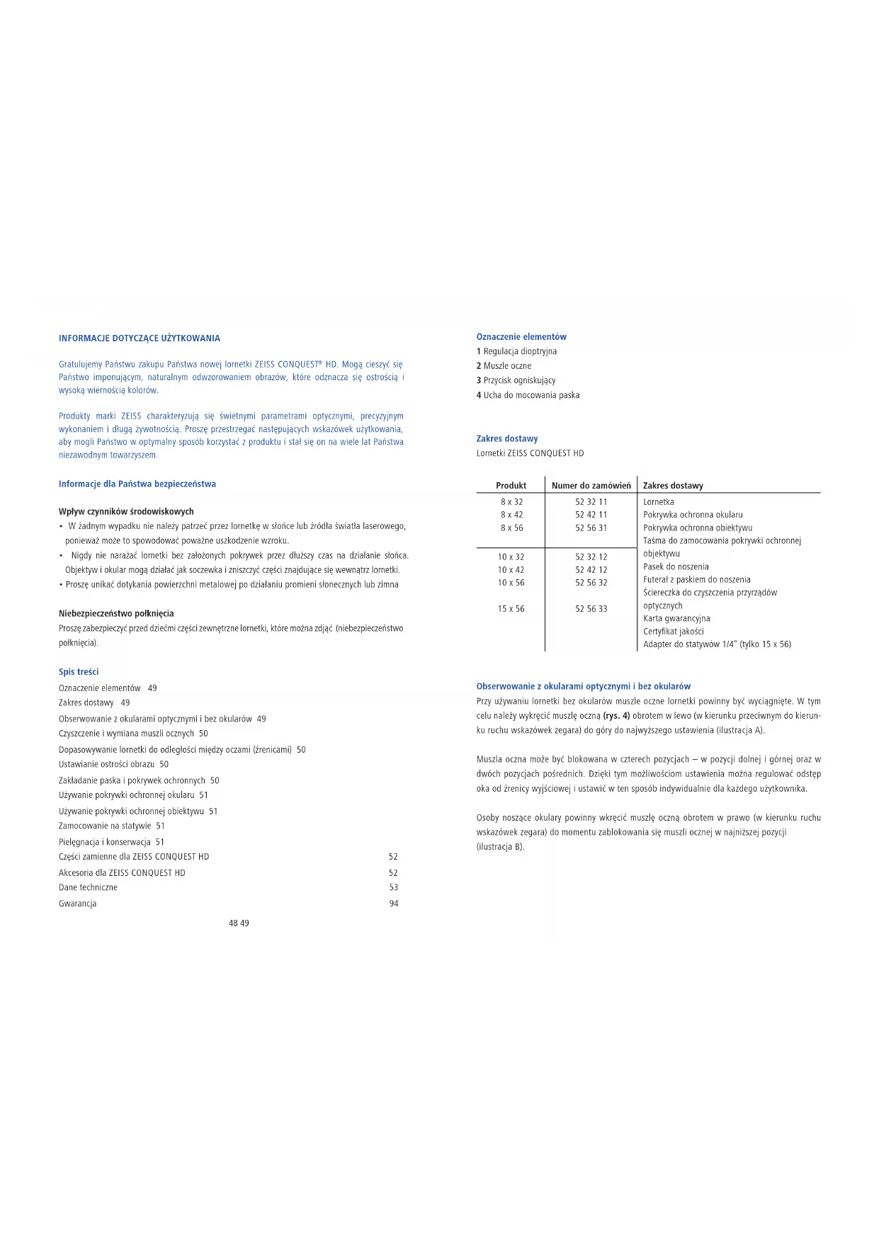 HD. Mogą cieszyć się Państwo imponującym, naturalnym odwzorowaniem obrazów, które odznacza się ostrością i wysoką wiernością kolorów. Produkty marki ZEISS charakteryzują się świetnymi parametrami optycznymi, precyzyjnym wykonaniem i długą żywotnością. Proszę przestrzegać następujących wskazówek użytkowania, aby mogli Państwo w optymalny sposób korzystać z produktu i stał się on na wiele lat Państwa niezawodnym towarzyszem. Informacje dla Państwa bezpieczeństwa Wpływ czynników środowiskowych W żadnym wypadku nie należy patrzeć przez lornetkę w słońce lub źródła światła laserowego, ponieważ może to spowodować poważne uszkodzenie wzroku. Nigdy nie narażać lornetki bez założonych pokrywek przez dłuższy czas na działanie słońca. Objektyw i okular mogą działać jak soczewka i zniszczyć części znajdujące się wewnątrz lornetki. Proszę unikać dotykania powierzchni metalowej po działaniu promieni słonecznych lub zimna Niebezpieczeństwo połknięcia Proszę zabezpieczyć przed dziećmi części zewnętrzne lornetki, które można zdjąć (niebezpieczeństwo połknięcia). Spis treści Oznaczenie elementów 49 Zakres dostawy 49 Obserwowanie z okularami optycznymi i bez okularów 49 Czyszczenie i wymiana muszli ocznych 50 Dopasowywanie lornetki do odległości między oczami (źrenicami) 50 Ustawianie ostrości obrazu 50 Zakładanie paska i pokrywek ochronnych 50 Używanie pokrywki ochronnej okularu 51 Używanie pokrywki ochronnej obiektywu 51 Zamocowanie na statywie 51 Pielęgnacja i konserwacja 51 Części zamienne dla ZEISS CONQUEST HD 52 Akcesoria dla ZEISS CONQUEST HD 52 Dane techniczne 53 Gwarancja 94 Oznaczenie elementów 1 Regulacja dioptryjna 2 Muszle oczne 3 Przycisk ogniskujący 4 Ucha do mocowania paska Zakres dostawy Lornetki ZEISS CONQUEST HD Produkt Numer do zamówień Zakres dostawy 8 x 32 8 x 42 8 x 56