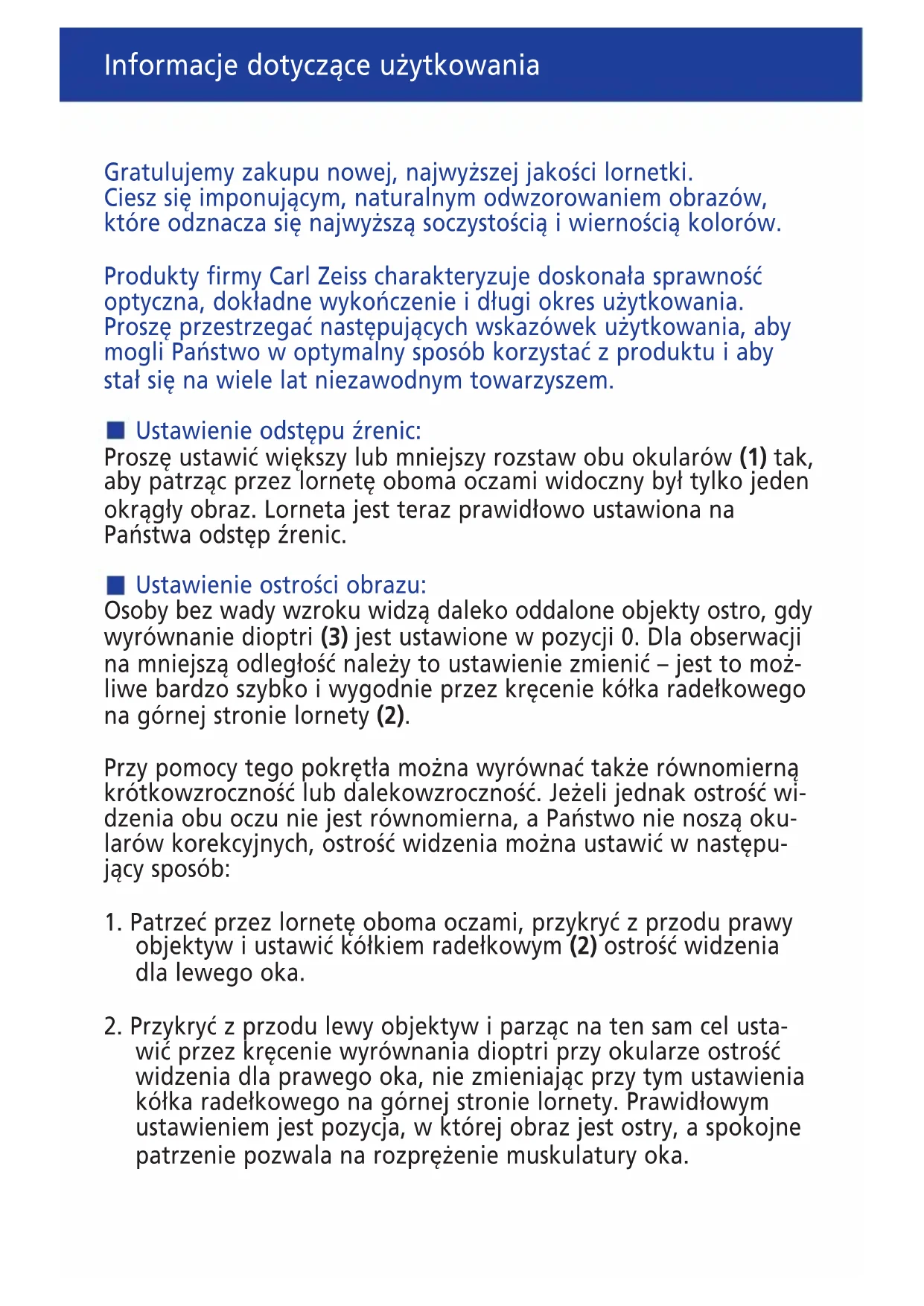 wić przez kręcenie wyrównania dioptri przy okularze ostrość widzenia dla prawego oka, nie zmieniając przy tym ustawienia kółka radełkowego na górnej stronie lornety. Prawidłowym ustawieniem jest pozycja, w której obraz jest ostry, a spokojne patrzenie pozwala na rozprężenie muskulatury oka. Informacje dotyczące użytkowania 02_20x60S_innen_pant.qxd 10.03.2009 9:07 Uhr Seite 18901190 Zeiss 02_GBH 20x60 S_Innen / S. 19 / Pantone Reflex Blue / Schwarz 20 x 60 S W ten sposób zostaje wyrównana różna refrakcja oczu. Oba oczy widzą ostro i wyraźnie. Wyrównanie wad wzroku przy lornecie 20x60 S nie jest potrzeb- ne, jeżeli przy obserwacji używają Państwo swoich okularów ko- rekcyjnych, ponieważ wyrównują one różnice refrakcji obu oczu i korygują także błędy astygmatyczne. Ustawienie lornety na różne odległości obserwacji następuje przy pomocy kółka radełkowego na górnej stronie lornety. Osoby noszące okulary korekcyjne mogą wywinąć krawędź mięk- kiej gumowej muszli na brzeg okularu, patrz B. Osoby nie noszące okularów korekcyjnych mogą używać lornety z wyciągniętymi mu- szlami – patrz A; przestawienie wymaga jedynie dwóch ruchów. Prawidłowa obserwacja z wykorzystaniem stabilizacji: System optyczny lornety 20x60 S można ustabilizować przez naciś- nięcie przycisku (4) – Pozwala to na daleko idącą eliminację „rozchwiania“ obrazu. Do dłuższej obserwacji z jednego miejsca bardzo przydatny jest statyw do kamery. Muszle oczne należy mocno przyłożyć do brwi lub do okularów i ustawić ostrość obrazu obserwowanego objektu przy pomocy kółka radełkowego na gór- nej stronie lornety. Pielęgnacja i konserwacja Lornetki marki Carl Zeiss nie wymagają specjalnej pielęgnacji. Większe zabrudzenia (np. ziarnka piasku) na soczewkach nie po- winny być wycierane, lecz wydmuchiwane albo usuwane pędzel- kiem z włosia. Ślady palców mogą po pewnym czasie atakować powierzchnie soczewek. Powierzchnie soczewek można najprościej oczyścić, chuchając na nie i wycierając je czystą ściereczką do okularów albo papierem do okularów. Środkiem zapobiegającym zaatakowaniu elementów optycznych przez grzyb, co jest możliwe szczególnie w tropikalnym klimacie, jest przechowywanie lornetki w suchym miejscu i ciągła wentylacja zewnętrznych powierzchni soczewek. 02_20x60S_innen_pant.qxd 10.03.2009 9:07 Uhr Seite 19901190 Zeiss 02_GBH 20x60 S_Innen / S. 20 / Pantone Reflex Blue / Schwarz Ważna wskazówka: Proszę transportować lornetę 20 x 60 S, o ile jest to możliwe, tylko w odpowiedniej walizce lub w futerale do noszenia, które są dos- tępne jako wyposażenie dodatkowe – lorneta jest tu odpowiednio chroniona. Podczas transportu należy zwrócić uwagę na to, aby przycisk stabilizacji nie został przypadkowo naciśnięty przez przed- mioty leżące na lornecie. Proszę dobrze przechować oryginalne opakowanie. Przy dłuższych transportach zalecamy używanie tego opakowania. Uwaga