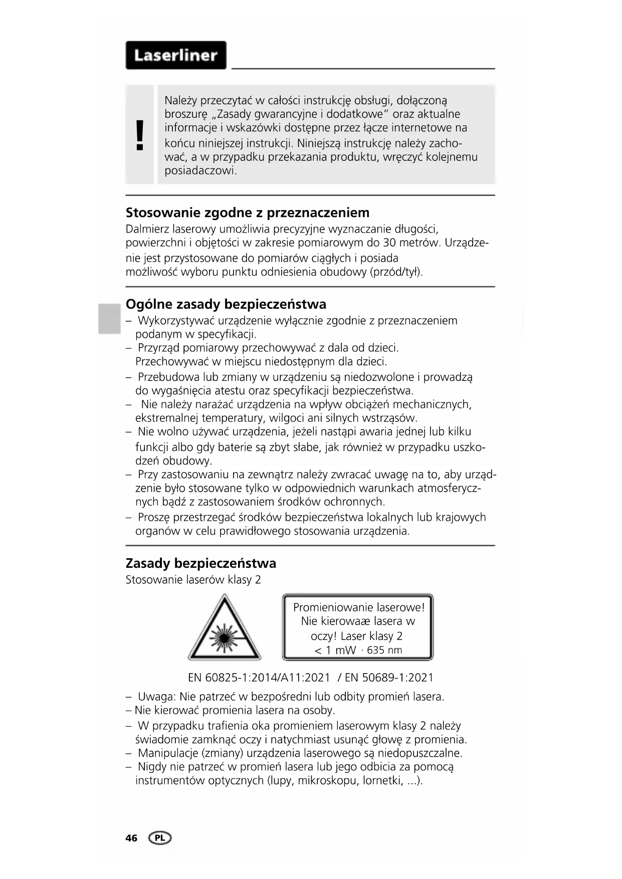 - 635 nm EN 60825-1:2014/A11:2021 / EN 50689-1:2021 – Wykorzystywać urządzenie wyłącznie zgodnie z przeznaczeniem podanym w specykacji. – Przyrząd pomiarowy przechowywać z dala od dzieci. Przechowywać wmiejscu niedostępnym dla dzieci. – Przebudowa lub zmiany w urządzeniu są niedozwolone i prowadzą do wygaśnięcia atestu oraz specykacji bezpieczeństwa. – Nie należy narażać urządzenia na wpływ obciążeń mechanicznych, ekstremalnej temperatury, wilgoci ani silnych wstrząsów. – Nie wolno używać urządzenia, jeżeli nastąpi awaria jednej lub kilku funkcji albo gdy baterie są zbyt słabe, jak również wprzypadku uszko- dzeń obudowy. – Przy zastosowaniu na zewnątrz należy zwracać uwagę na to, aby urząd- zenie było stosowane tylko w odpowiednich warunkach atmosferycz- nych bądź z zastosowaniem środków ochronnych. – Proszę przestrzegać środków bezpieczeństwa lokalnych lub krajowych organów w celu prawidłowego stosowania urządzenia. Ogólne zasady bezpieczeństwa Stosowanie zgodne zprzeznaczeniem Należy przeczytać wcałości instrukcję obsługi, dołączoną broszurę „Zasady gwarancyjne idodatkowe” oraz aktualne informacje iwskazówki dostępne przez łącze internetowe na końcu niniejszej instrukcji. Niniejszą instrukcję należy zacho- wać, awprzypadku przekazania produktu, wręczyć kolejnemu posiadaczowi.